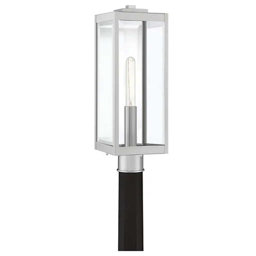 Bring a clean and elegant style to your landscape with the Westover Outdoor Post Mount by Quoizel. Featuring a sleek and simplistic silhouette, this fixture is comprised of a stainless-steel framing to support clear beveled glass panels at each side. A single cylindrical candleholder maintains its minimalistic style, holding an incandescent bulb to emit a warm, bright light. Ideal for illuminating pathways surrounding a contemporary structure, this fixture is adaptable enough to suit a range of styles.