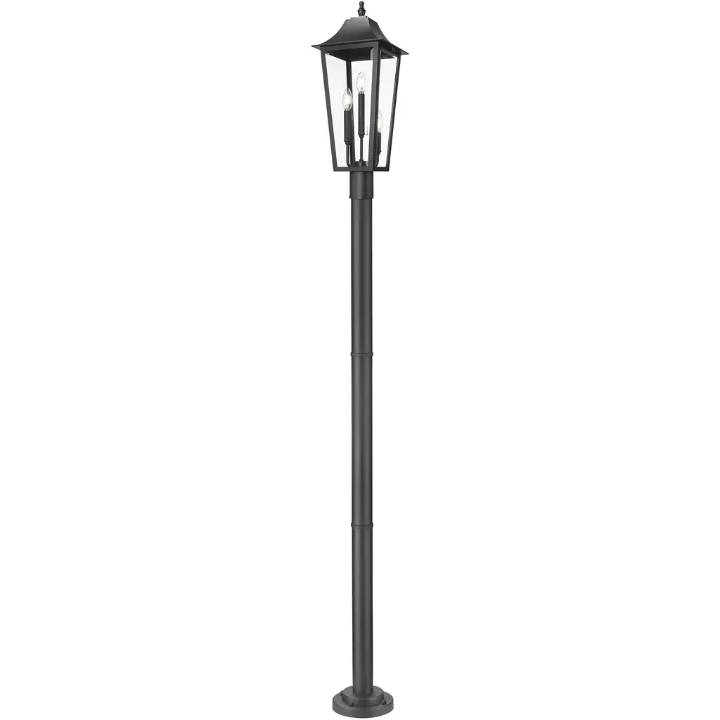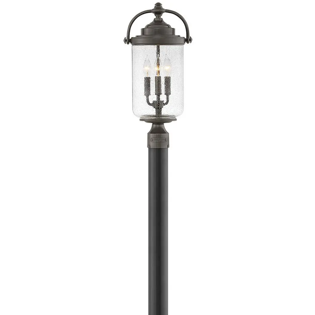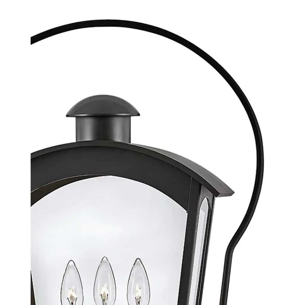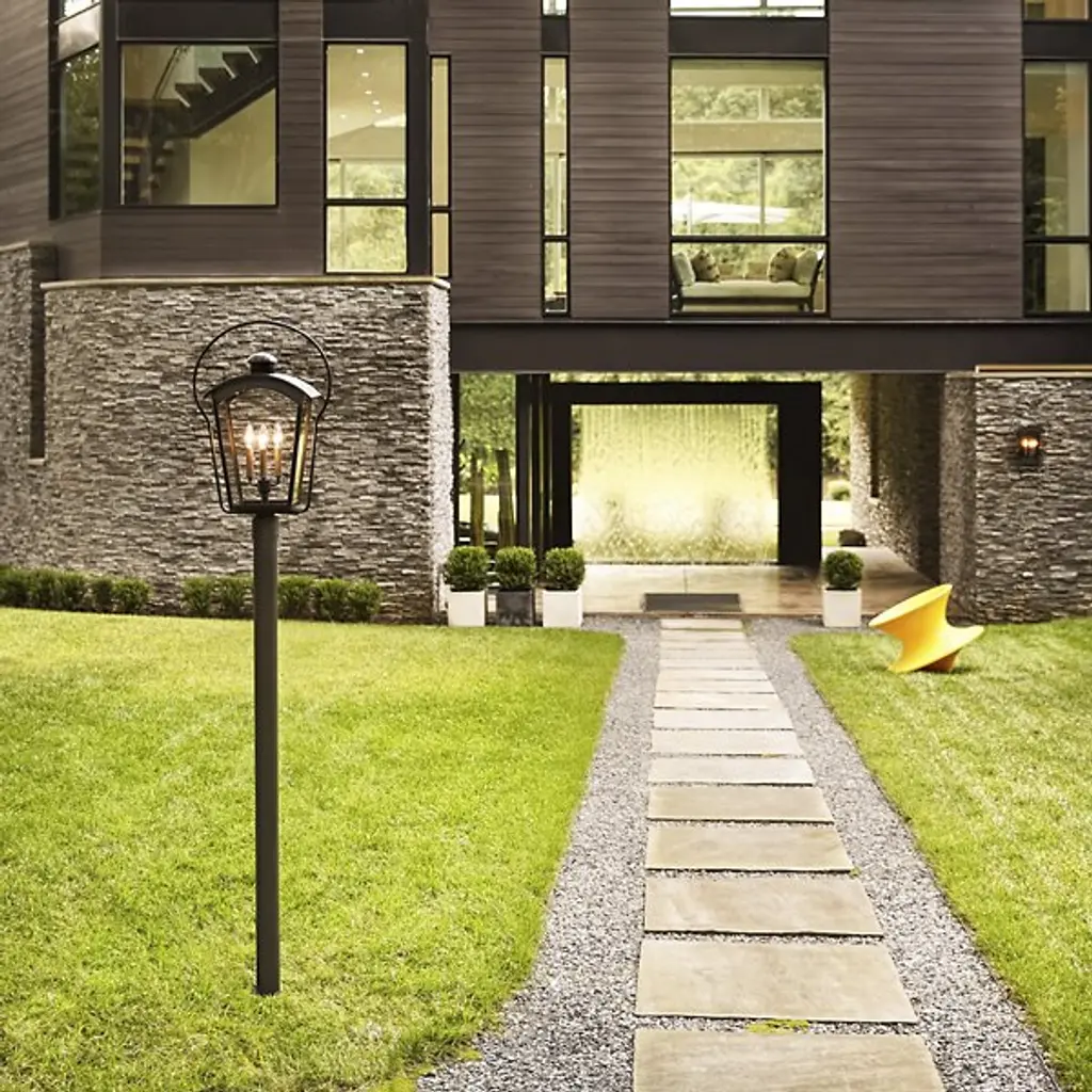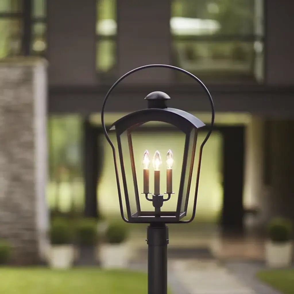 Make a tasteful addition to outside pathways and entrances with the Yale Outdoor Post Light from Hinkley Lighting. A robust aluminum structure done in the spirit of a New Orleans gas lantern, it extends wet-listed candelabra-style lamping up from a rounded post housing, while a slender metal framework flares out around it, seating a curving roof with a rounded accent inside a slender yoke-style handle. Each open side of the metal framework seats a clear glass pane that intercepts direct glare from the lamping, mellowing it into a warm, even glow around the fixture. As it happens, the post is sold separately.