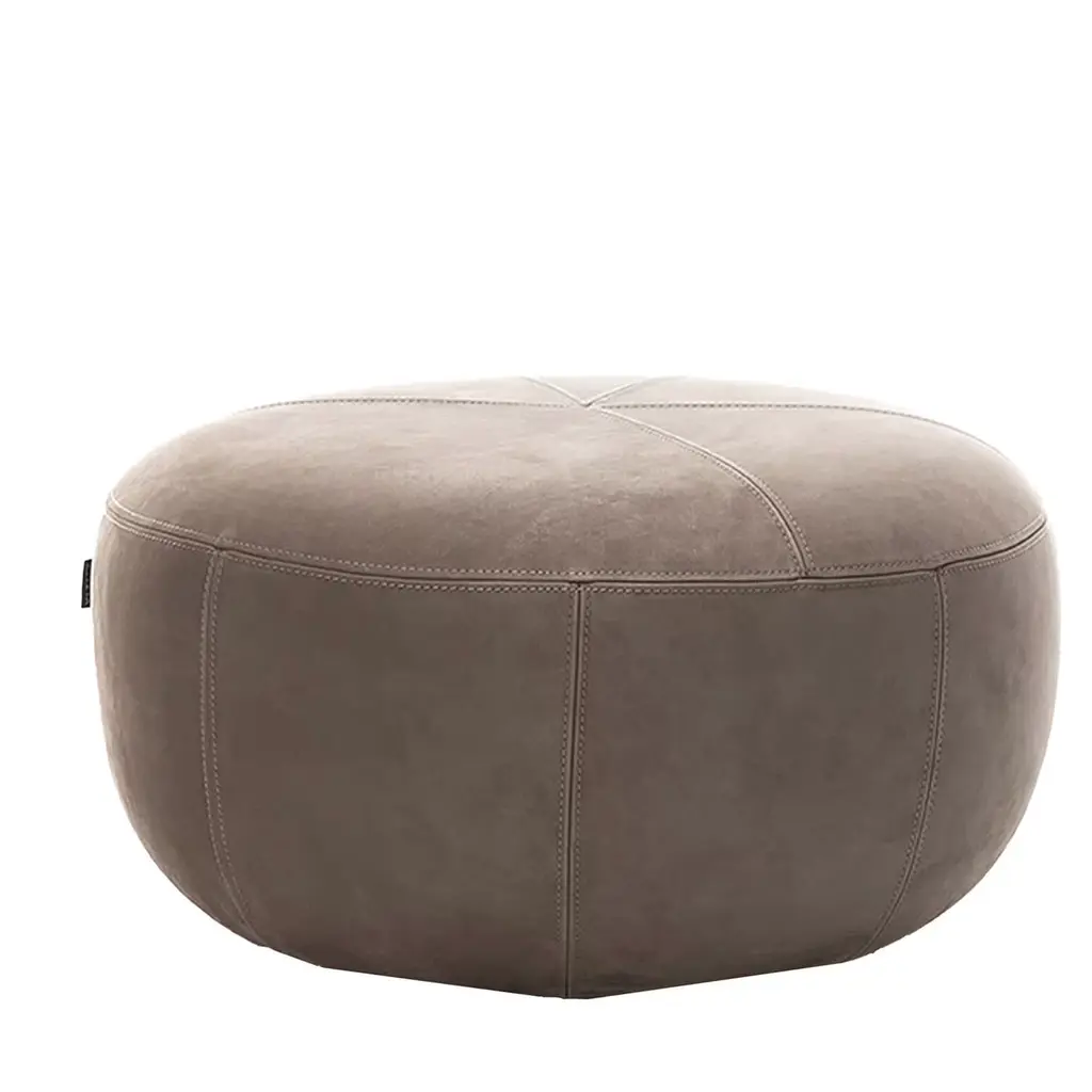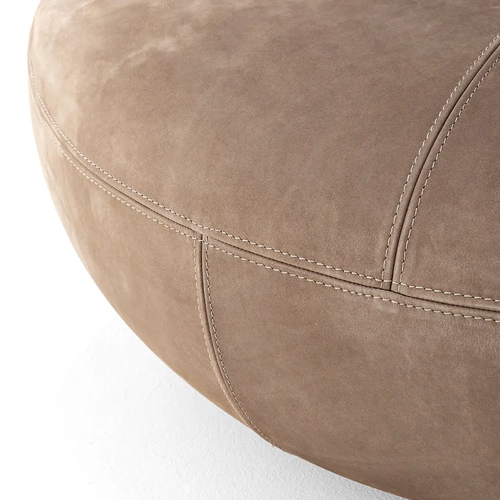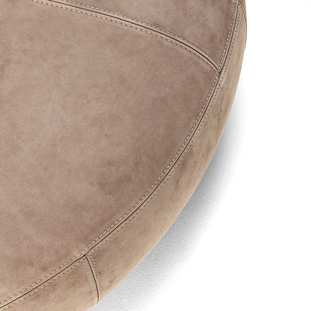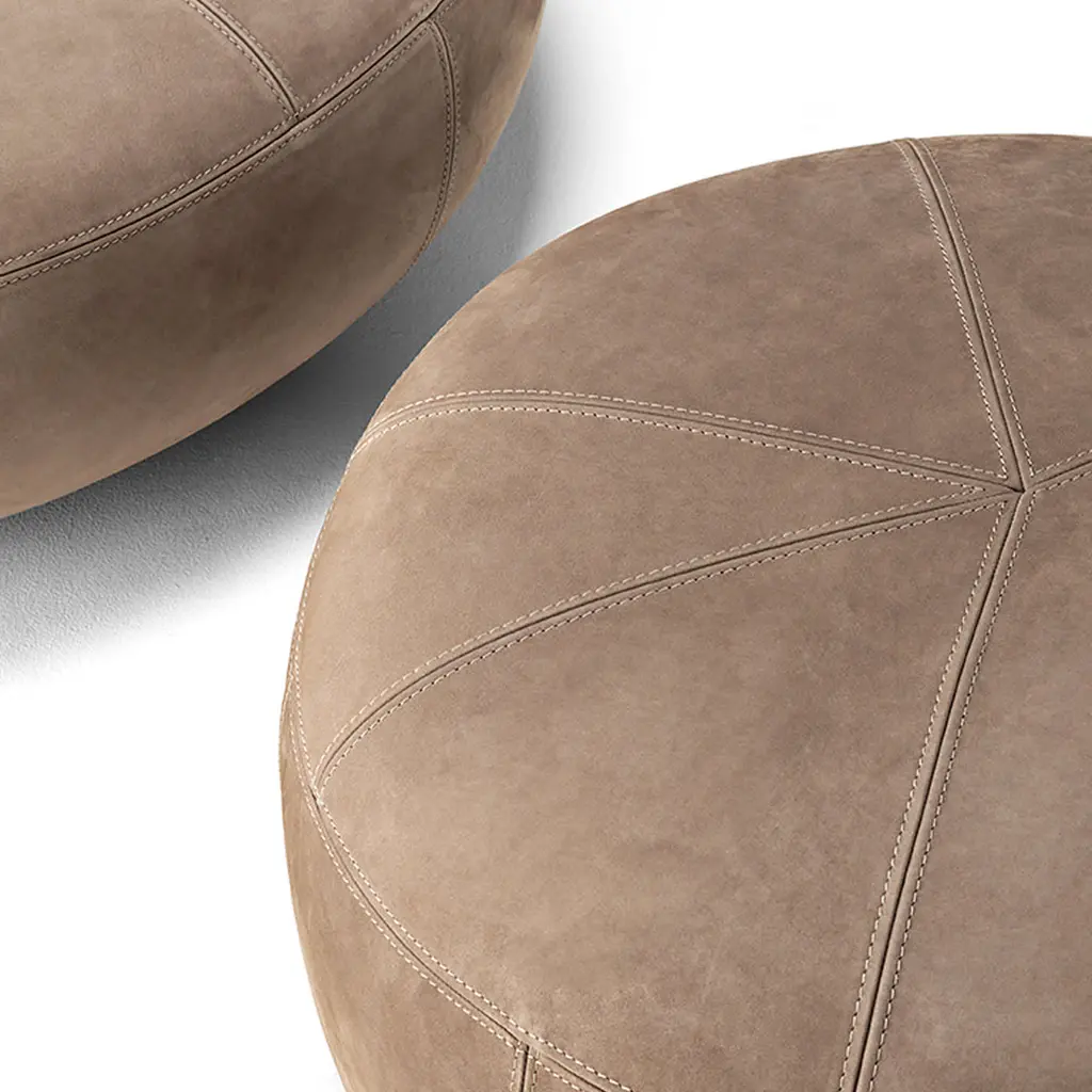 Perfect for welcoming an unexpected guest to a chilled conversation or as a wide footrest to share, this pouf boasts an elegant monolithic design that well adapts to both domestic and contract spaces. The wedge stitching finishing its taupe Visone Nubuck leather cover attests to its sartorial character. Please consult the Concierge for available finishing variants and pricing of the protective cover. If the products are placed completely outside, nightcovers that can be purchased at an extra price are recommended. Please contact the Concierge for further information and options.