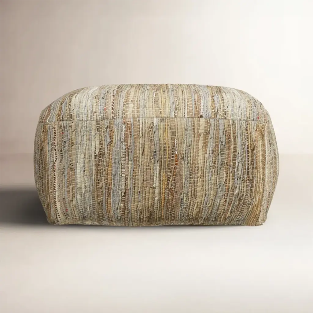 18"x18"x14" Beige Ivory Multicolor + Multi Hand Woven Wool Jute Blend Pouf | Square