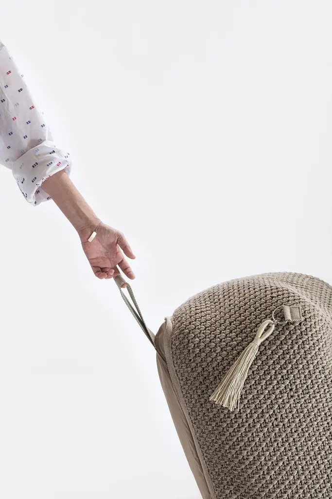 This beanbag is a cube shaped comfy seating solution. Kids love it and so do adults who prefer a more laid-back seating. It can be a part of your permanent living room layout or a carry out object you can enjoy in your garden or terrace.In addition to being a contemporary design studio IOTA soft living is a social project that employs, teaches and empowers women who are otherwise unable to work by teaching them the crochet technique and providing them work which they can carry out from their homes.Maintenance: Clean regularly with a vacuum cleaner, the use of chemical cleaning materials may harm the product. Try to address stains before they dry with a moist cloth. Products may vary up to 5% as objects are handmade.