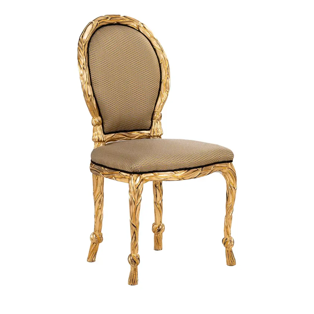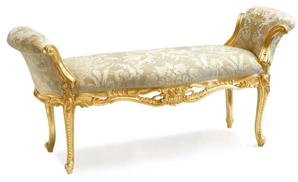 Fragonard line expresses Jumbo Collection’s design approach, where artisanal heritage, decorativism and experimentation in the use of materials, techniques and processes meet. The soft furnishing of the line, elegant and versatile, is characterized by a base with a very antiqued gold leaf finish and seat covered in fabric.Fragonard pouf with structure in solid beechwood finished in antique gold with patina J291O. Padding in foam. Upholstery in fabric MIL.18.02.