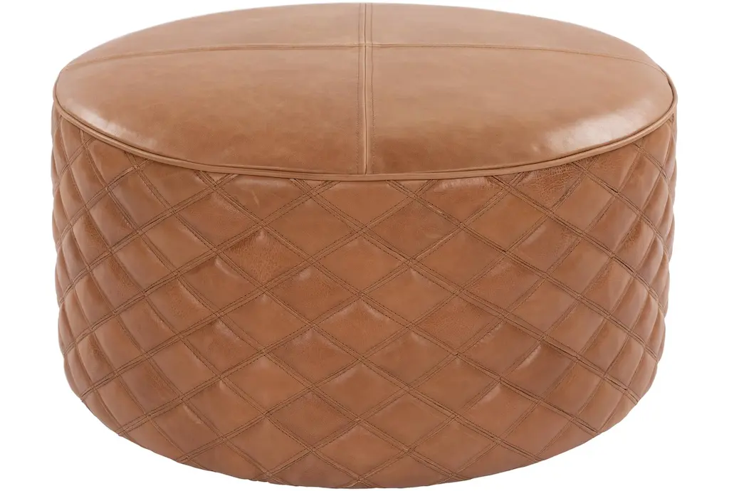 28 Diameter Round Camel Leather Quilted Pouf Ottoman