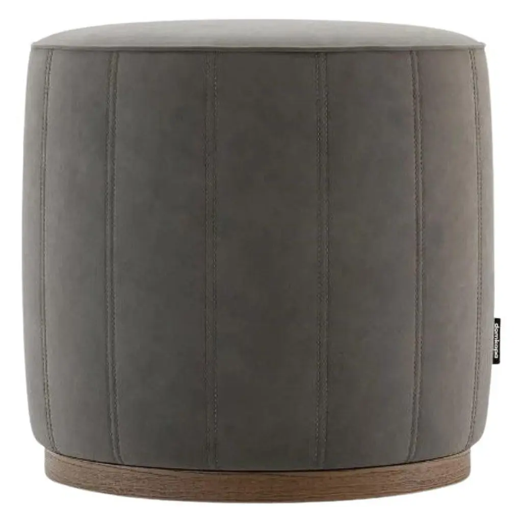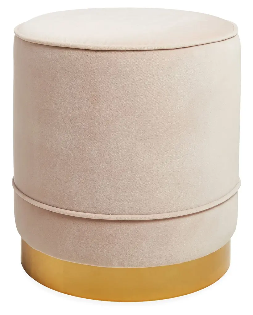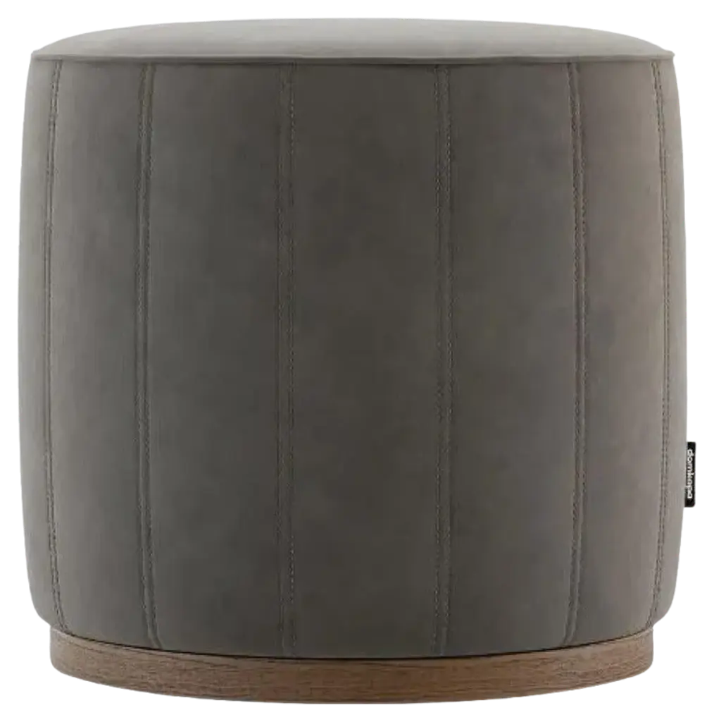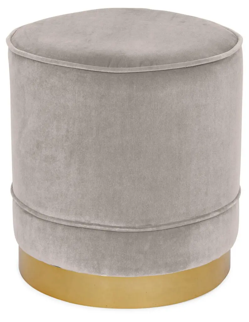 Striking it its simplicity, this refined pouf will fit in a wide variety of contemporary decors. Silky velvet in a neutral hue of gray upholsters the cylindrical wooden frame, which is generously padded with different density foam. A gold-finished metal element coats the wooden base adding a precious, bright accent to the whole design.
