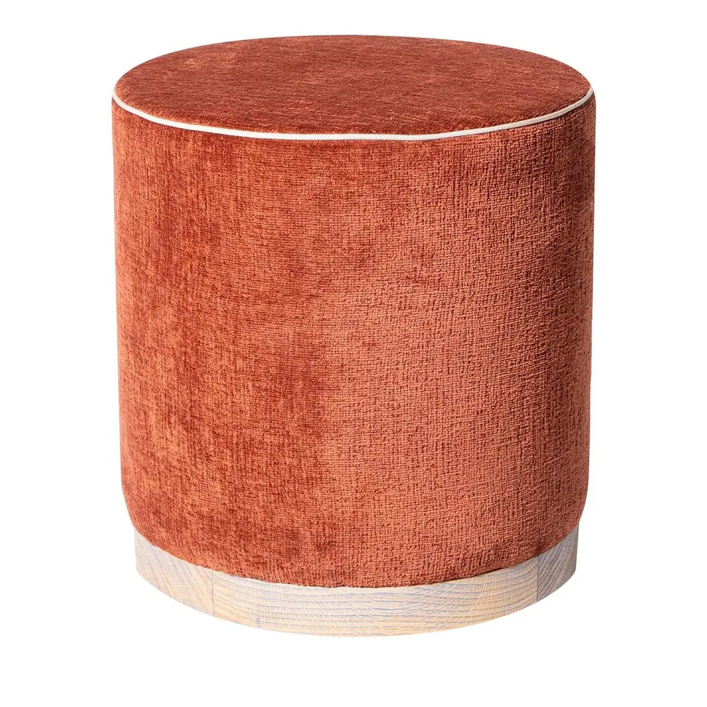 A versatile accent piece, this cylindrical pouf adds a touch of warmth and texture to any space. Upholstered in rich red fabric, it features a plush cushioned top for comfort and a sturdy wooden base for stability. Whether used as a footrest, extra seating, or a decorative element, its minimalist design complements various interiors. The base can be customized to match different finishes and coverings. Contact the Concierge for available size options.