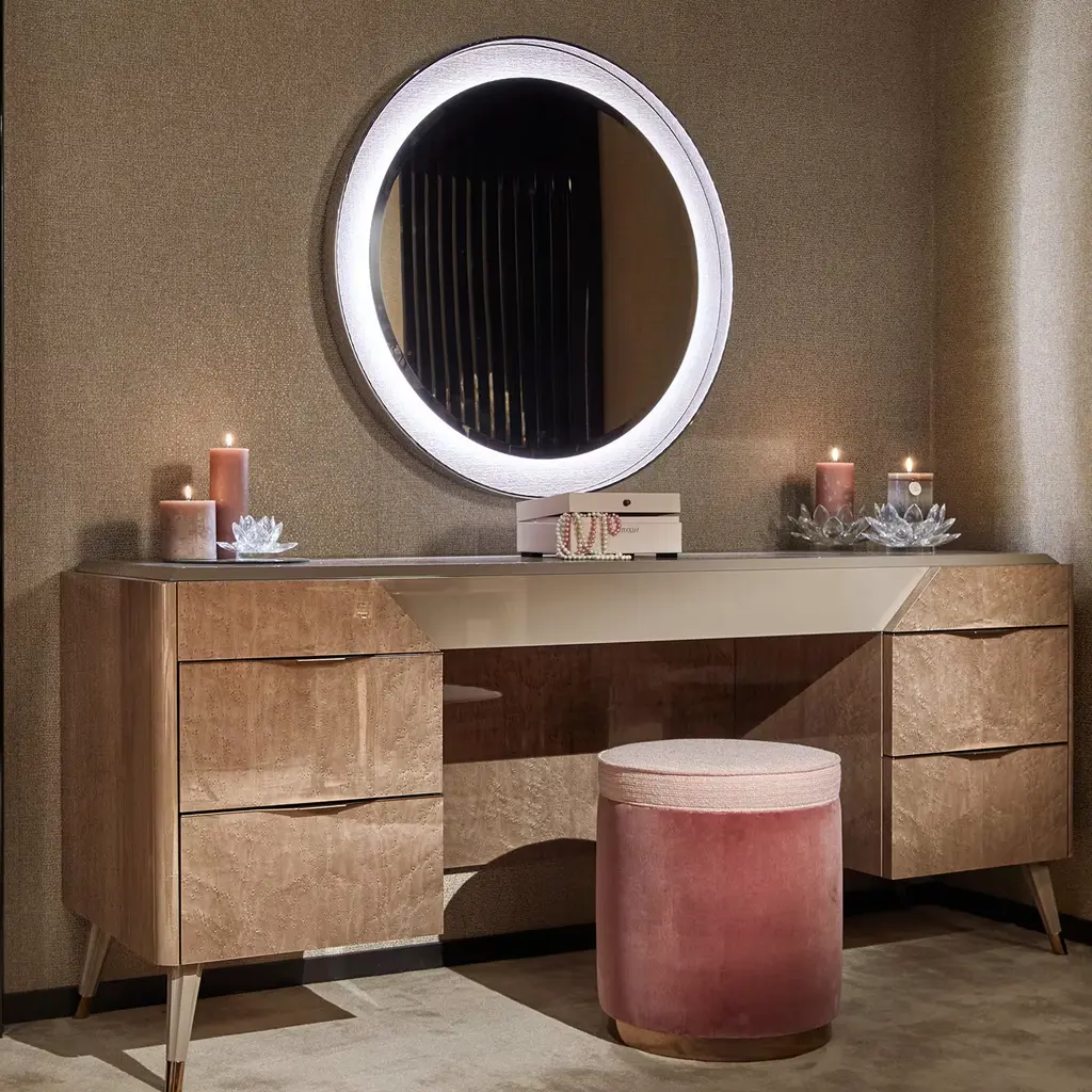 Add a rosy touch to a lounge space with the Alice Pouf. Shown here with a copper alloy base and pink velvet upholstery, the pouf is customizable to complement any lounge space, be it in a contemporary home or bar. A current must-have, the cylindrical pouf can act as seating, a footrest or a small accent table.