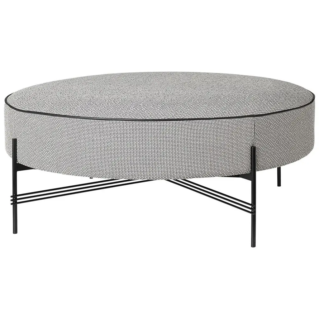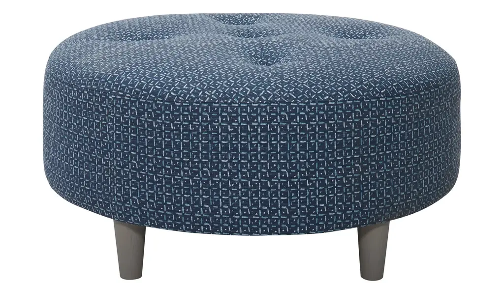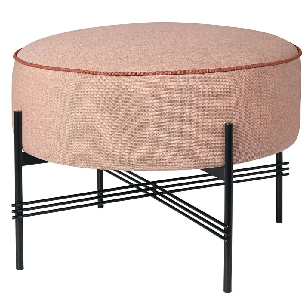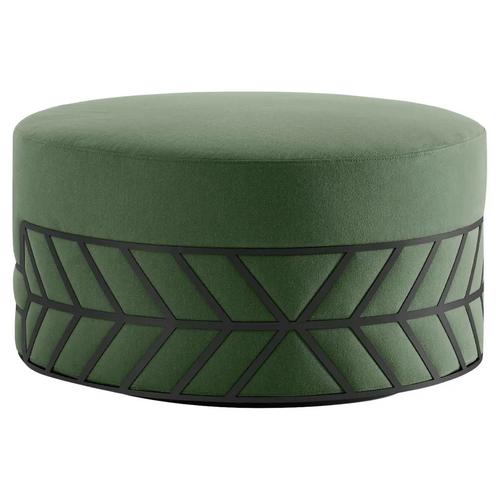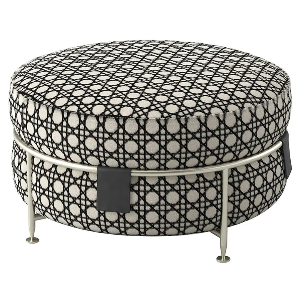 Amaretto is an ottoman made of plywood frame, polyurethane foam padded. Distressed paint finish Metal feet and ring.