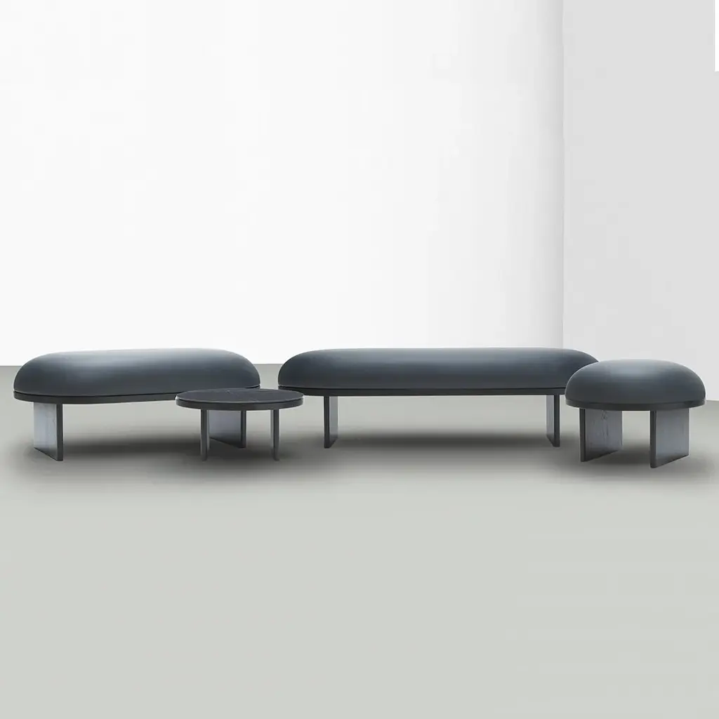 Meaning "to sit at ease" in Japanese, ANZA is a seating collection comprising a pouffe, bench and cofee table. The generous floating cushion allows for a dynamic seating while the soft outlines create a warm and sophisticated atmosphere. This collection, part of a wider modular system, aims at enhancing both domestic and public environments.