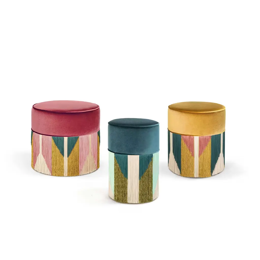 Channeling the glamour of the roaring twenties Art Deco era, this mustard pouf from the Treasure Collection merges bold diamond-inspired colors with opulent metallic accents. Wrapped in sumptuous mustard velvet and adorned with touches of feminine pink, wheat gold lurex, and teal fringes, this compact pouf (⌀ 40cm) epitomizes modern elegance and luxury. It is perfect for those seeking to infuse their space with a dash of sophisticated charm and timeless style. Each bespoke piece is stamped on the bottom of the pouf’s lining and personally signed, numbered, and dated by designer.