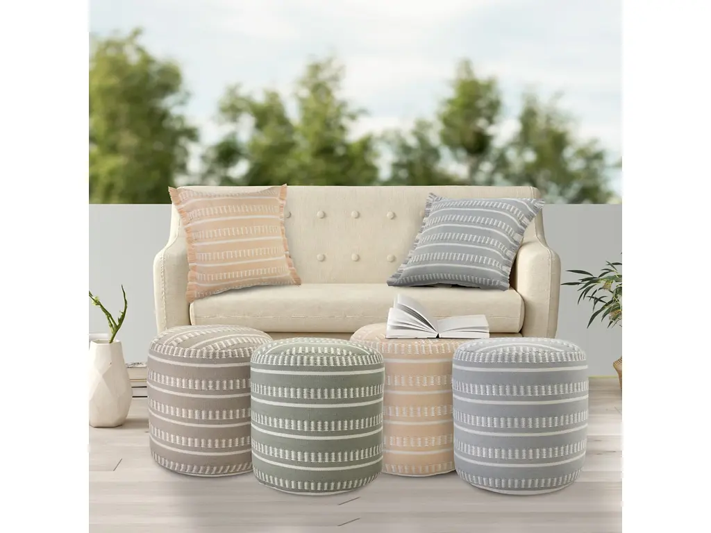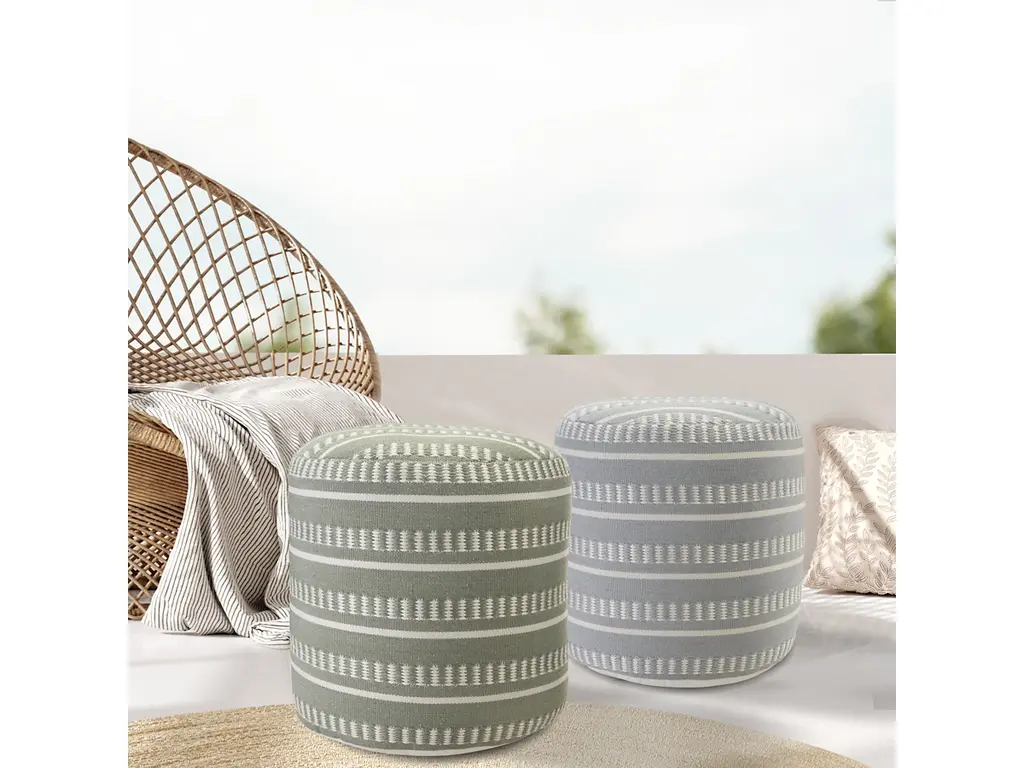 Looking for a functional and stylish addition to your home? Look no further than this indoor-outdoor pouf! Handmade in India using 100% polyester and filled with EPS balls, this pouf is both durable and comfortable. Its striped designs and earth tones add a touch of elegance to any space, making it the perfect accessory for your living room, patio, or garden. Whether you need extra seating or a footrest, this versatile pouf has got you covered. Don't settle for less - upgrade your decor with this beautiful handmade pouf today!