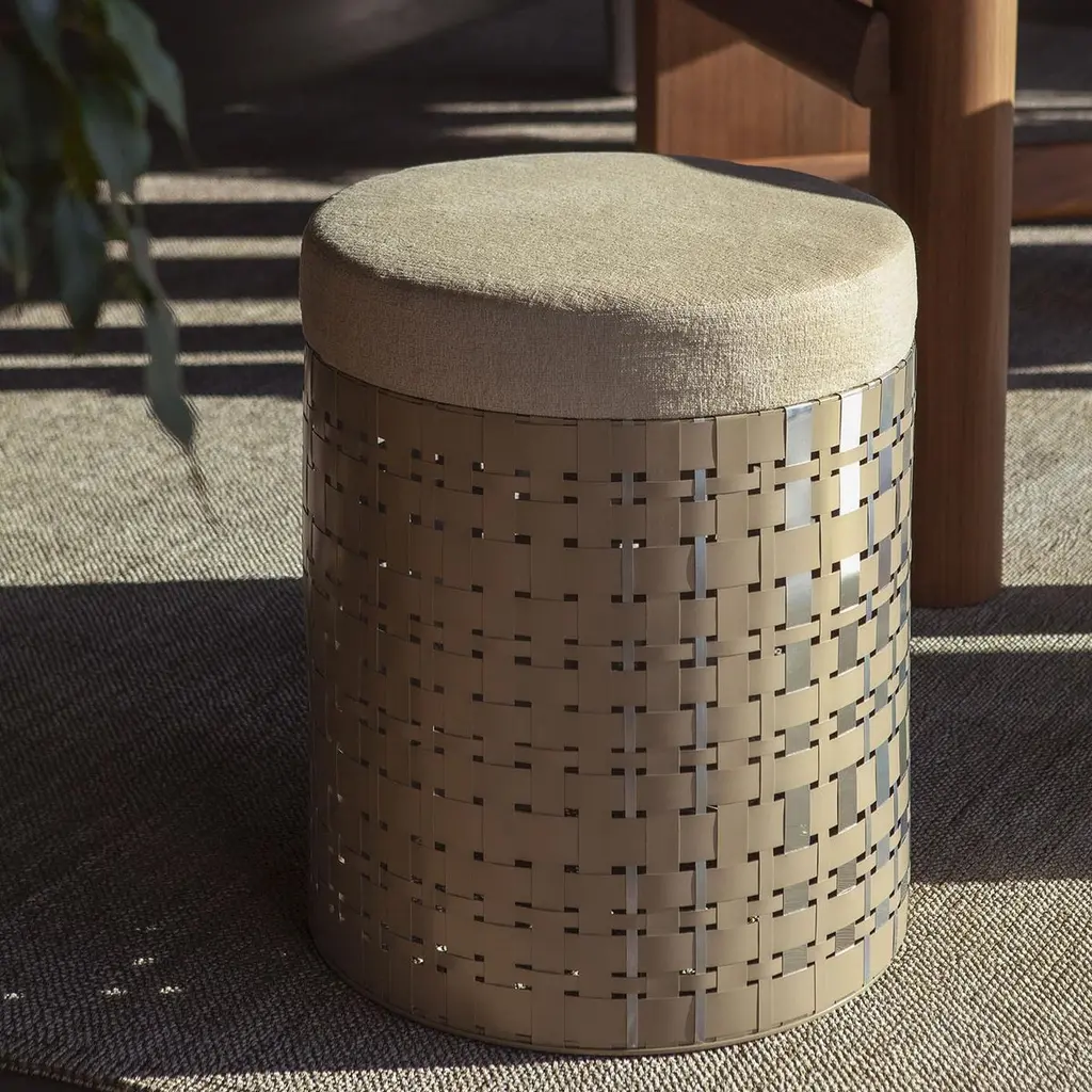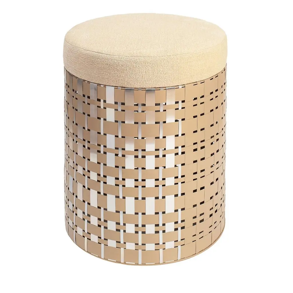 A clean cylindrical silhouette defines this pouf, elegant and compact design celebrating style and functionality. Distinguishing feature is the SPLOT® weft where champagne golden and natural aluminum are intertwined extensively up to the cushioned seat. Upholstered with a refined warm-toned beige fabric, the seat can be lifted for revealing a practical storage space