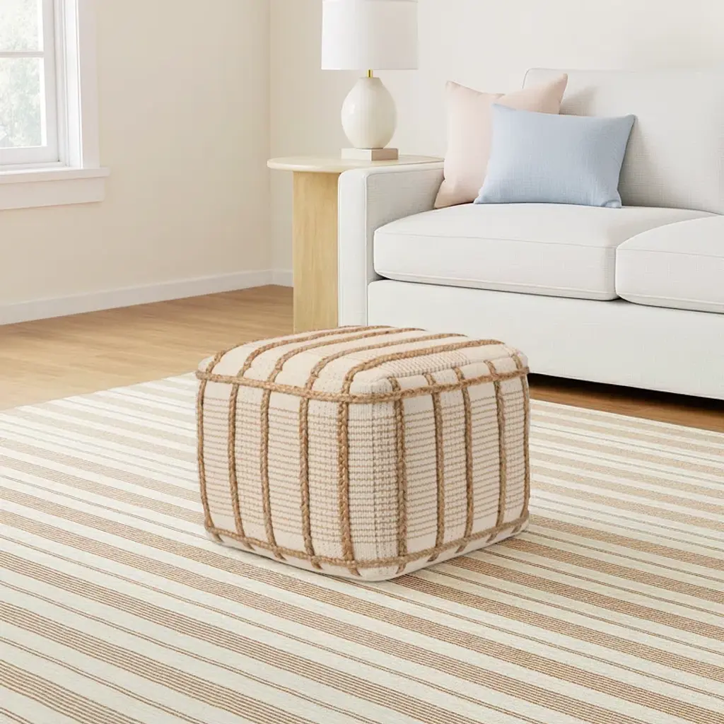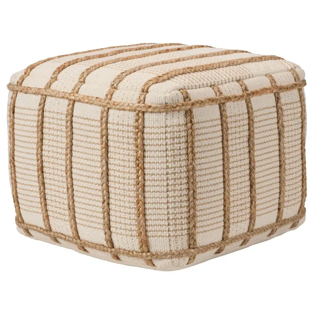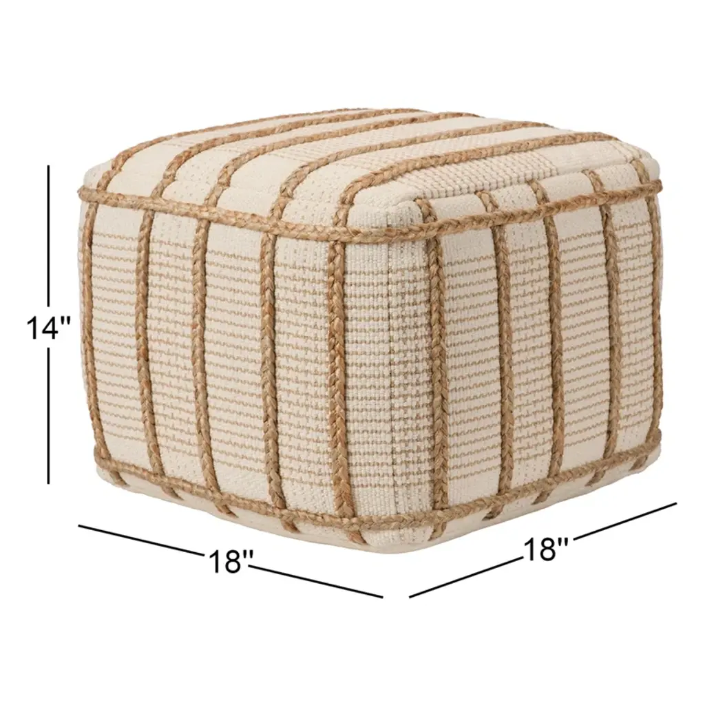This pouf delights with a soft, cream cotton base that contrasts braided, tan jute accents. The cube design allows for versatility while maintaining a chic look. This unique accent piece suits any indoor space as a footrest, ottoman, accent table, or additional seating.