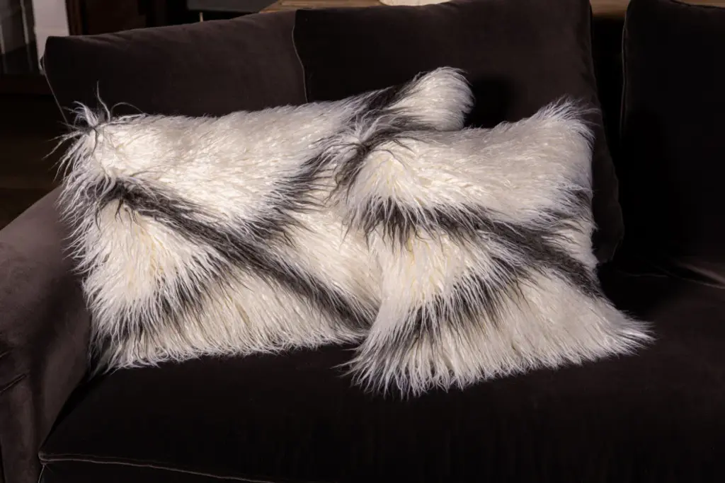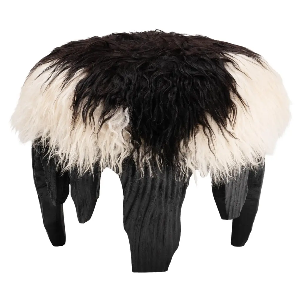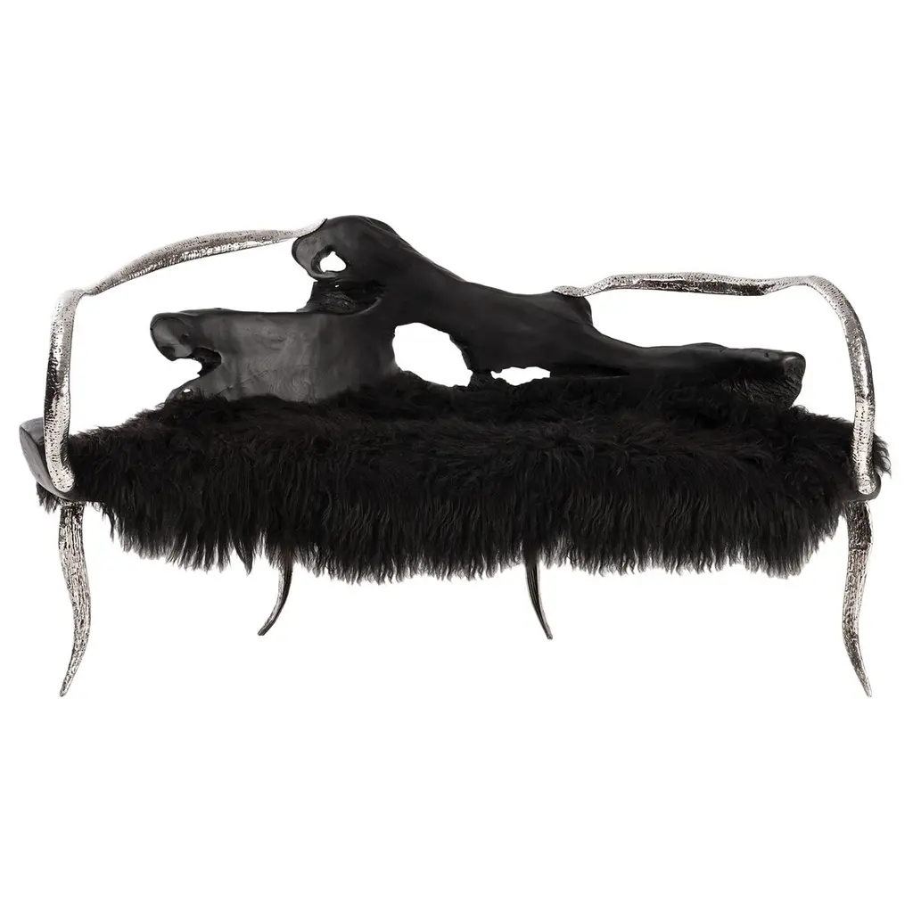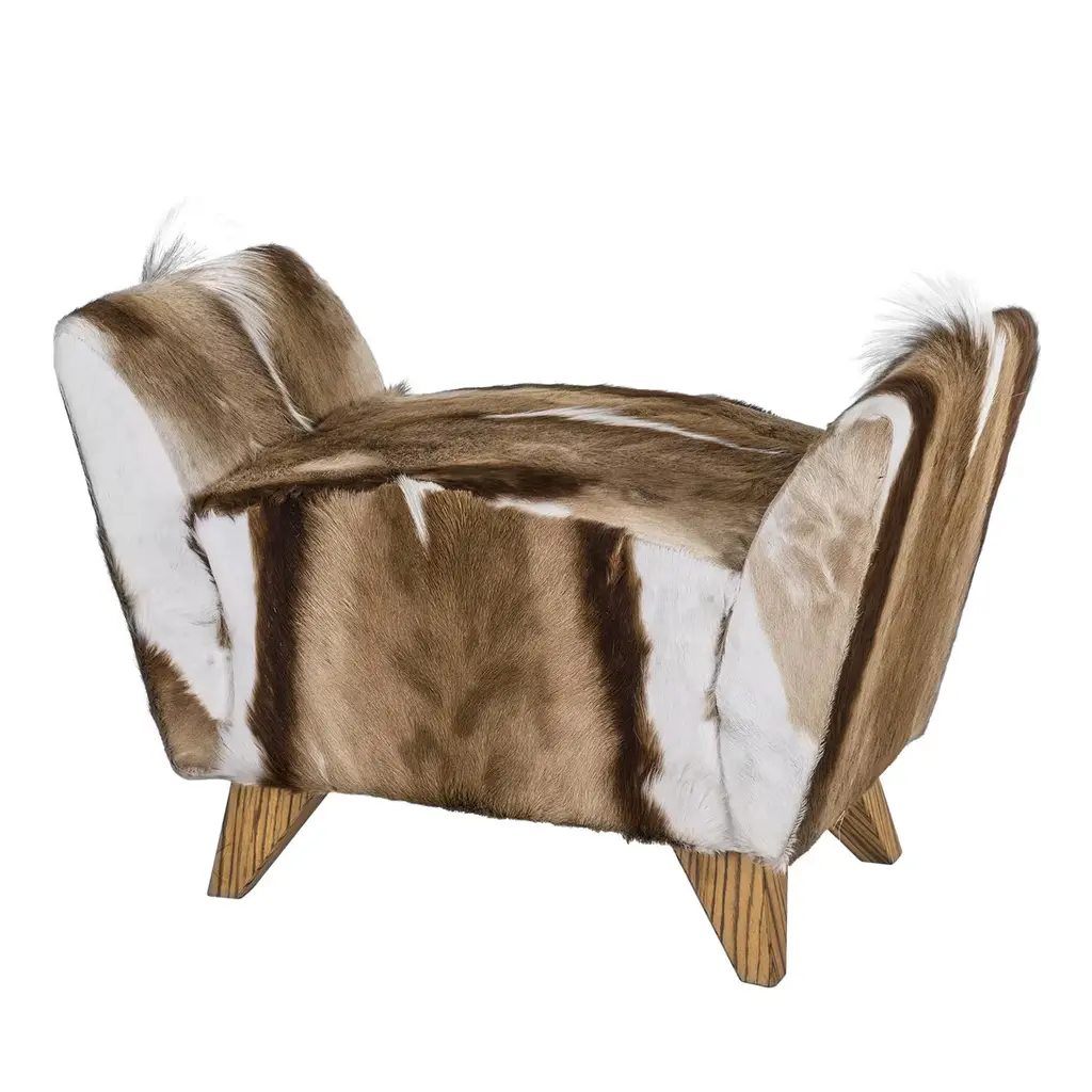 This stunning pouf is a perfect accent piece for a rustic or modern interior that will be enriched by the presence of Antelope fur upholstery. The textured and refined cover is a one-of-a-kind decorative cover in white and light brown that elevates the look or a living room or study, creating a stunning object of functional decor. The four curved legs are in bronze and add a contrastingly smooth surface to the piece for a unique effect. Designed by Carlo Rampazzi.
