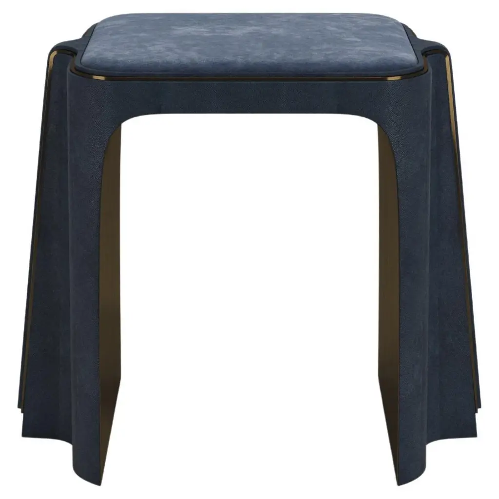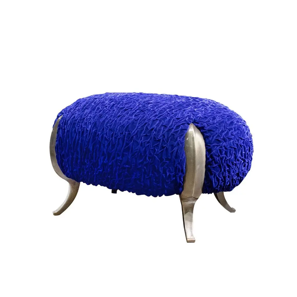 The Pouf Bague derives its name from its unique shape, which mimics the structure of a ring (or "bague" in French) that typically holds a precious stone. Instead of a gemstone, this design features a central padding covered in luxurious frotted blue velvet. The frame of the pouf is crafted from bronze casting, enhancing its elegant and artistic appeal.