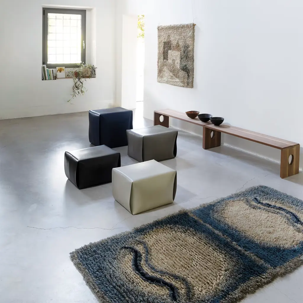 The Bao dark leather pouf is a refined bean bag chair, wrapped carefully in a single piece of soft, full-grain leather. Its folds resemble those of origami. The timeless, nostalgic shape is reminiscent of those old bedside tables from the '50s.