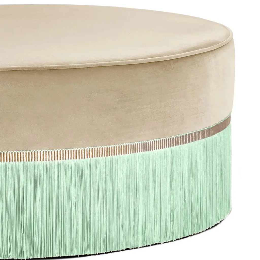 Subtle colors make a strong statement in this pouf from the Couture Geometric Collection. Designed to be used as a coffee table or seat, the pouf is crafted on a beechwood base, upholstered in velvet 100% trevira and completed with viscose fringe for a sturdy yet soft finished product. Made entirely in Italy, the pouf comes from a complete collection.