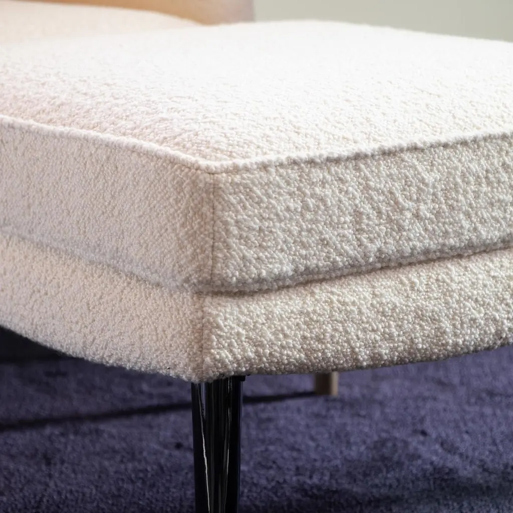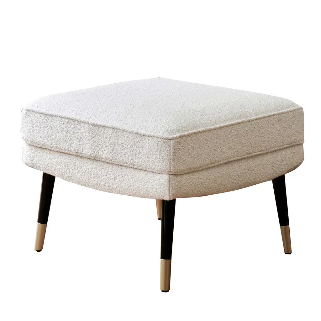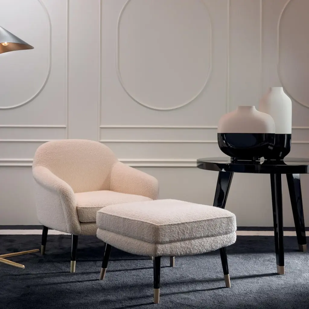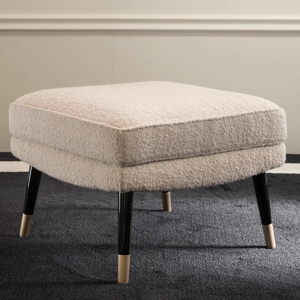 A comfortable seat with a Classic allure, this refined pouf can be arranged in multiples or paired with the Bernadette sofa to create a lounge look in a modern living room or bedroom. The midcentury inspiration is revealed in the conical wooden legs finished with a glossy black lacquer and accented with satin-bronzed metal ferrules. The padded seat has a height of 40 cm and is upholstered in soft, creamy ivory fabric. Legs are also available in brass-plated or chromed metal with a glossy finish.