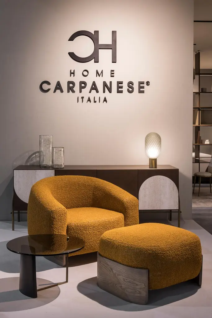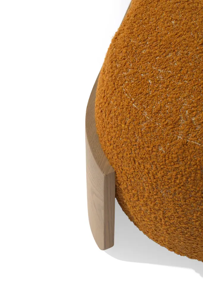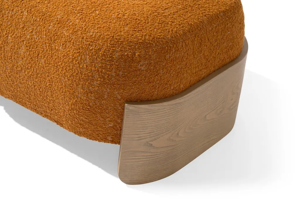 This particular pouff is characterized by a padded seat and two curved ash wood bases which seem to hug the cushion. The peculiarity is undoubtedly found in the new bouclé fabric with which it is upholstered.Finishing cod. 30 Fango (5 Gloss).The upholstery is Fabric cod. 9508 cat. C Orange color.Other finishings, fabrics and leathers are available.The item can be customized.