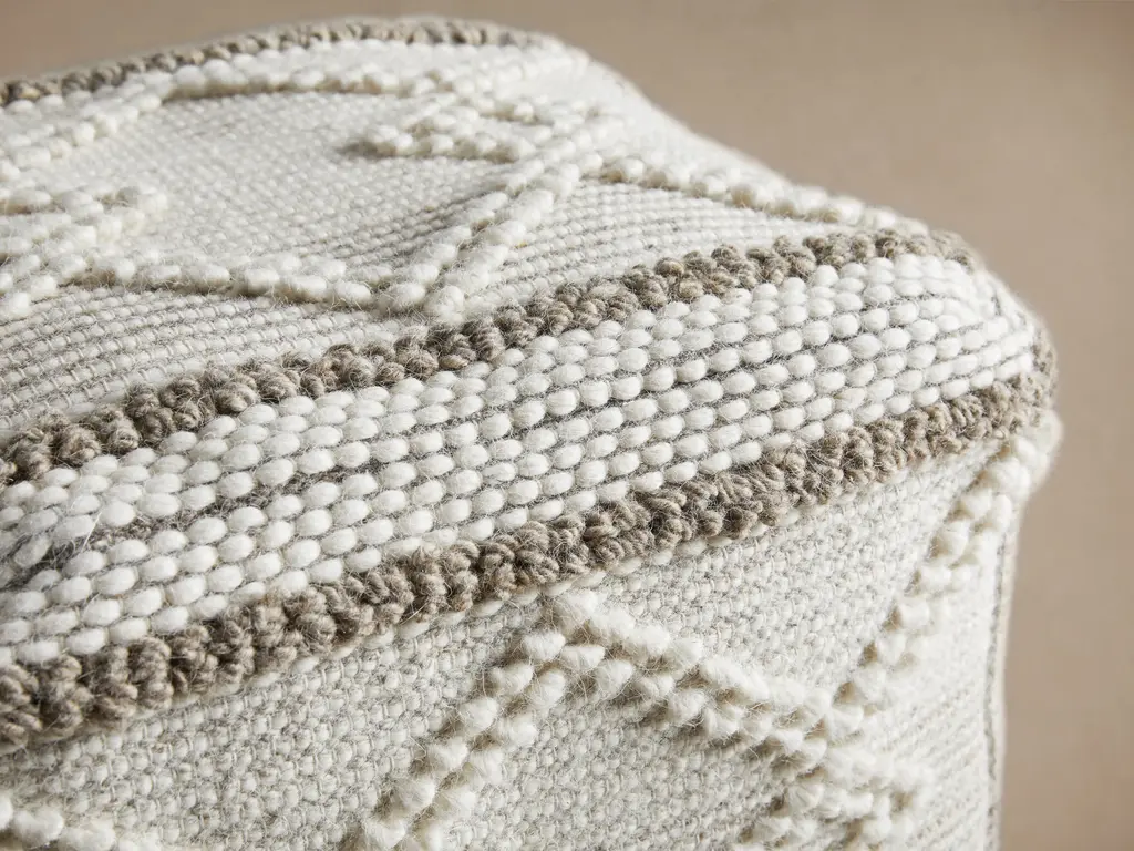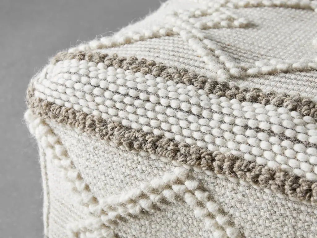 Handcrafted in shades of beige, cream, and brown, our Bexley Pouf’s textured look brings added comfort to any seating arrangement. Cover – top/side: 83% wool, 17% cotton; bottom: 100% cotton; lining: 100% polyester Filler – shell: 100% cotton; filling: 26% cotton, 25% polyester, 25% acrylic, 24% rayon Color and texture may vary slightly. No two poufs will appear exactly alike.