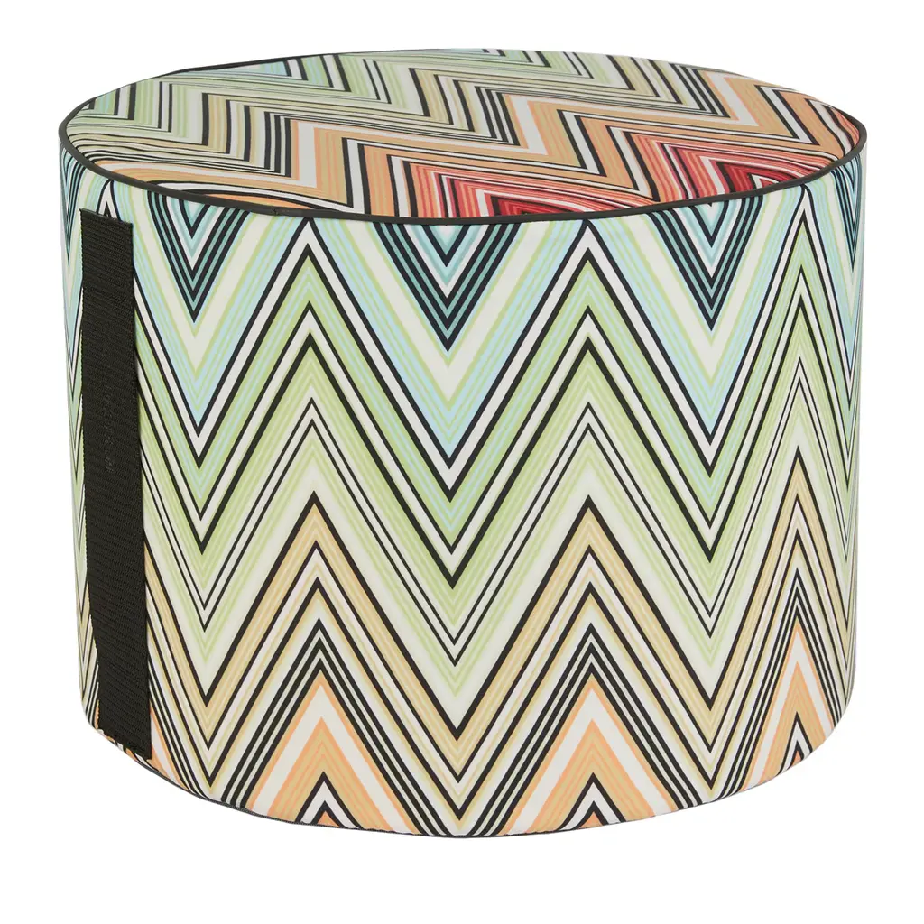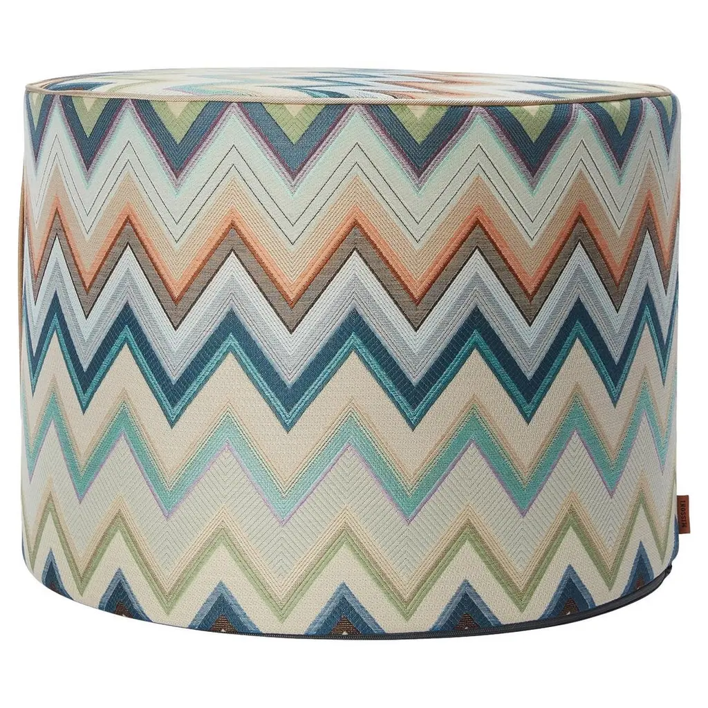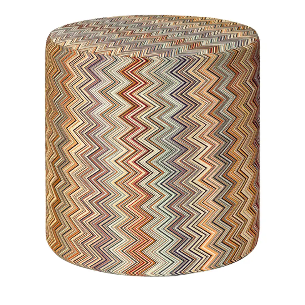A lively burst of colors, this stunning design is defined by a dynamic chevron motif combining multiple bold tones. A softly padded, welcoming pouf to combine with any contemporary decor style, it features a cylindrical shape upholstered with flame-retardant jacquard fabric. Please consult the Artemest catalog for other color options.