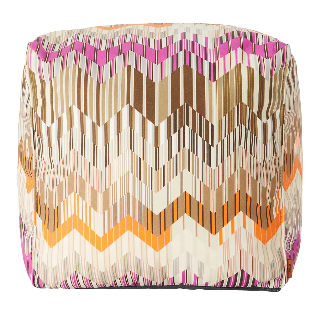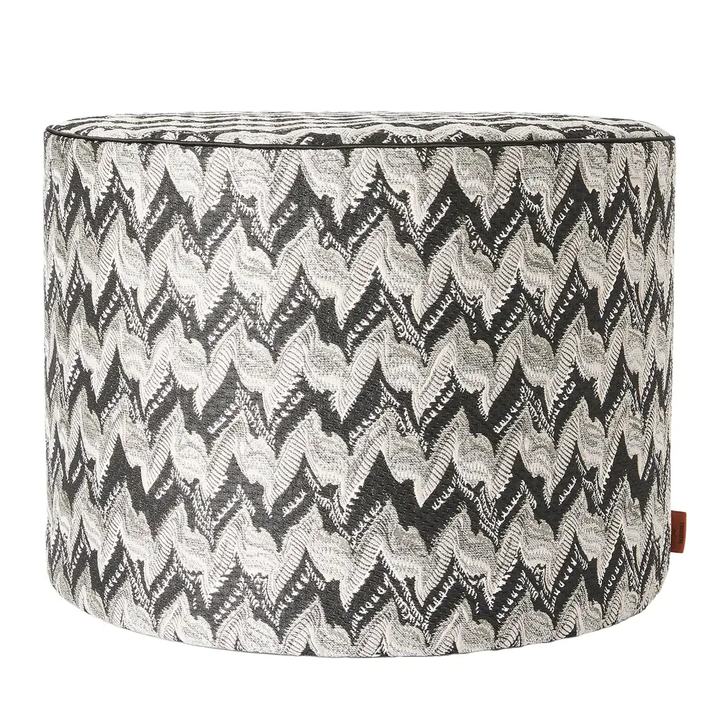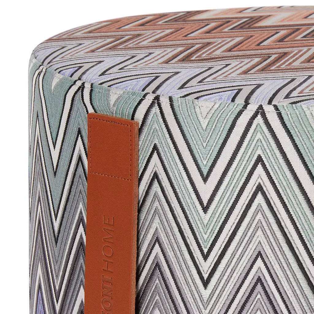 A lively burst of colors, this stunning design is defined by a dynamic chevron motif combining multiple bold tones. A softly padded, welcoming pouf to combine with any contemporary decor style, it features a cylindrical shape upholstered with flame-retardant jacquard fabric. Please consult the Artemest catalog for other color options.