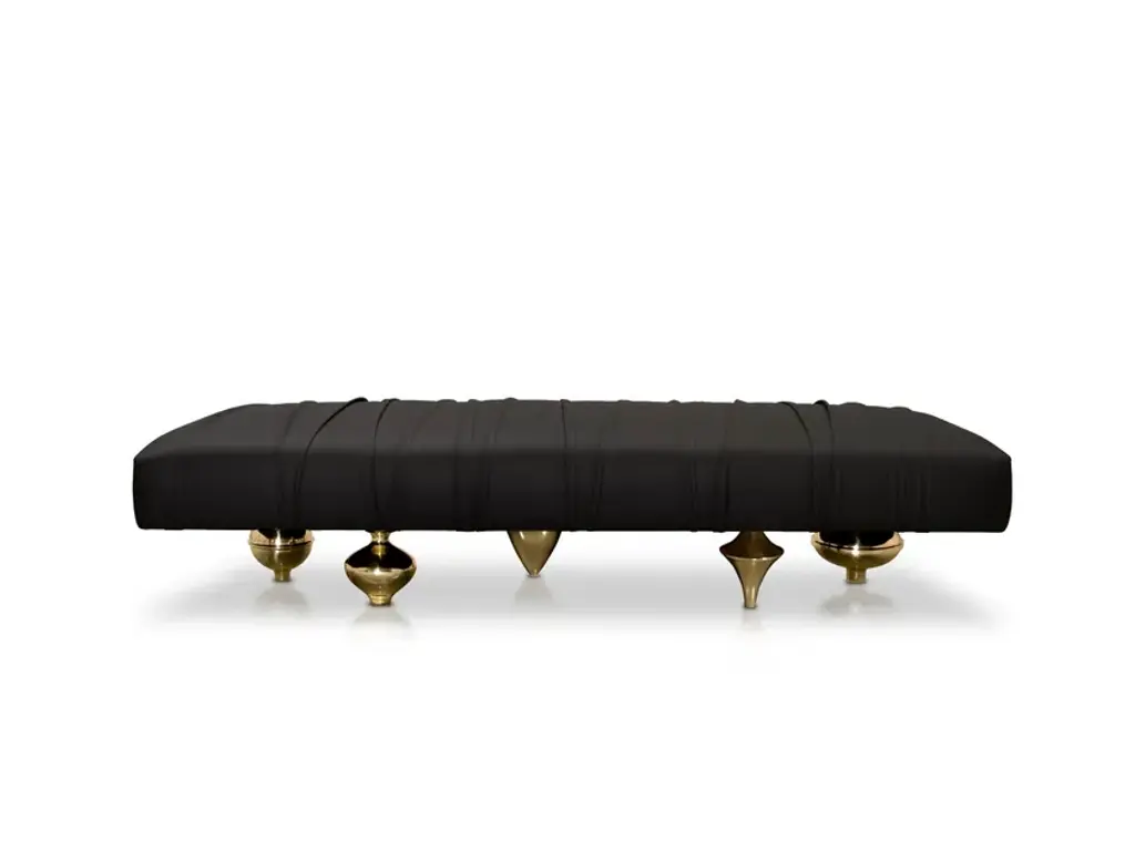 Black Upholstered Leather Pouf With Gold Finish Brass Legs, Made In Italy