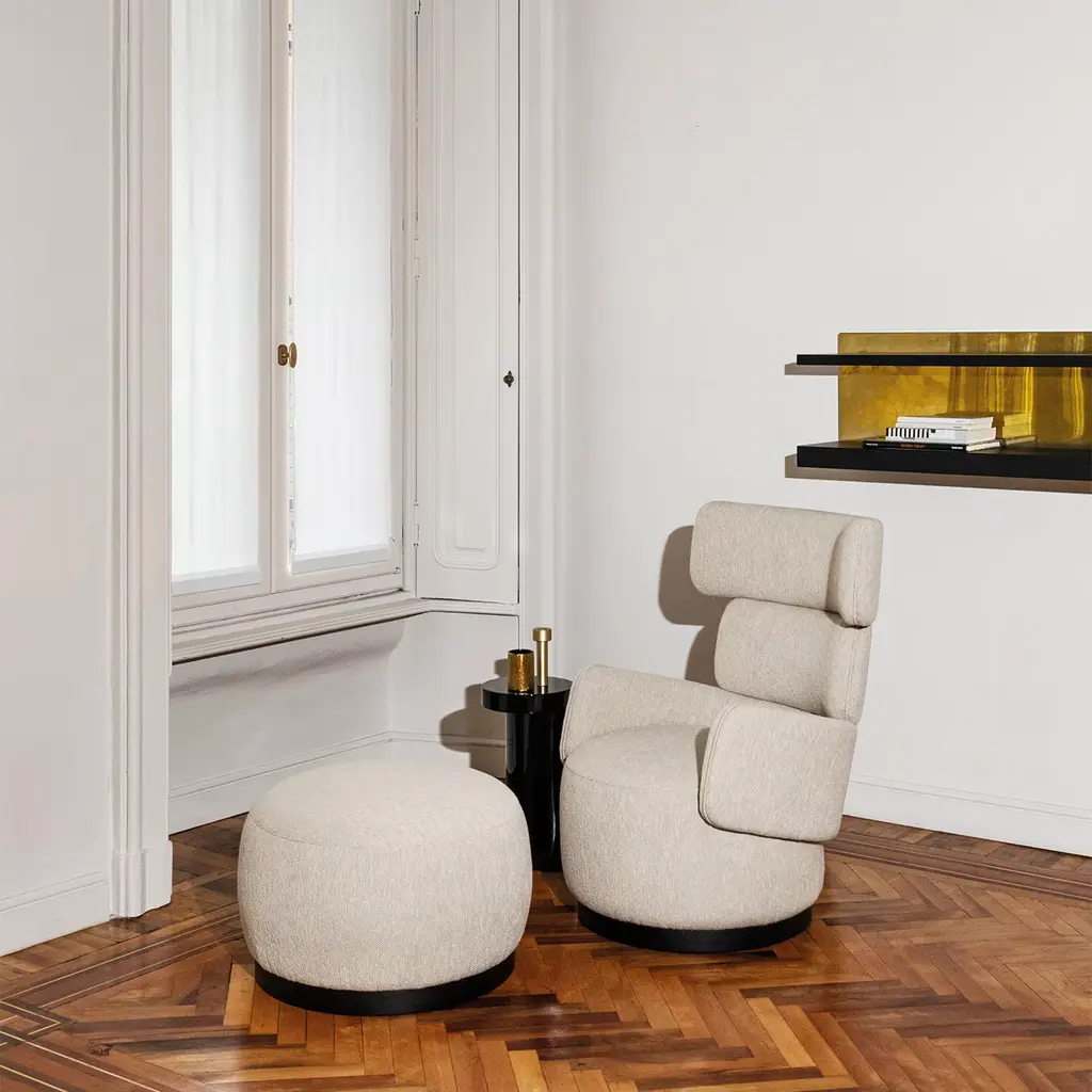The last segment that makes up the body of an ant, the Boris pouf, combined with the armchair, emphasizes the division of the structure into many elements, accentuating the parallelism between its padding and the body of the insect. Solid wood structure padded with polyurethane foam in different densities. Pre-upholstery in polyester wadding, upholstery in fabric or leather covering. More fabrics and leathers are available, please contact the concierge for more information.