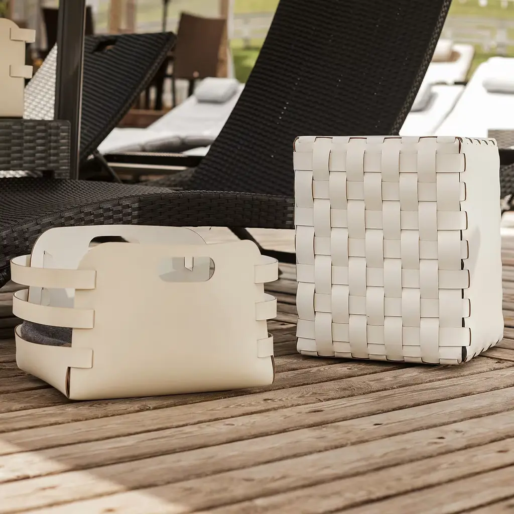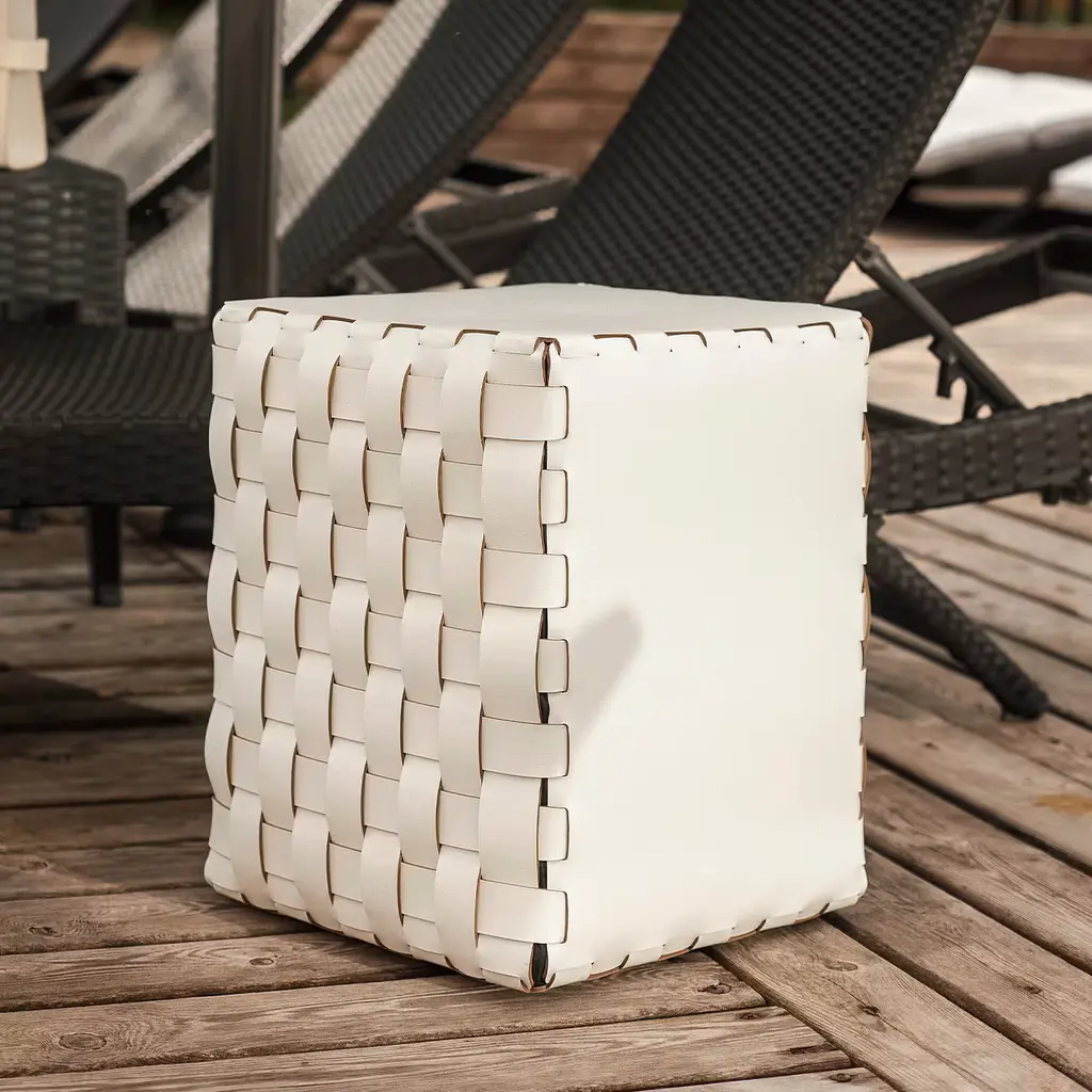 This compact and functional pouf is ideal for those seeking both comfort and style. The leather undergoes a specialized anti-vandal treatment resulting in enhanced durability against scratches and abrasions. It is suitable for indoor and outdoor home decoration. Its versatility extends beyond its size, serving as a comfortable footrest, an extra seat or a stylish accent piece to complement your existing furniture. Designed by Ekaterina Borovkova.