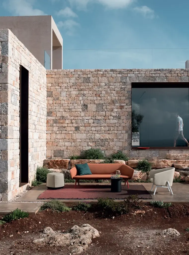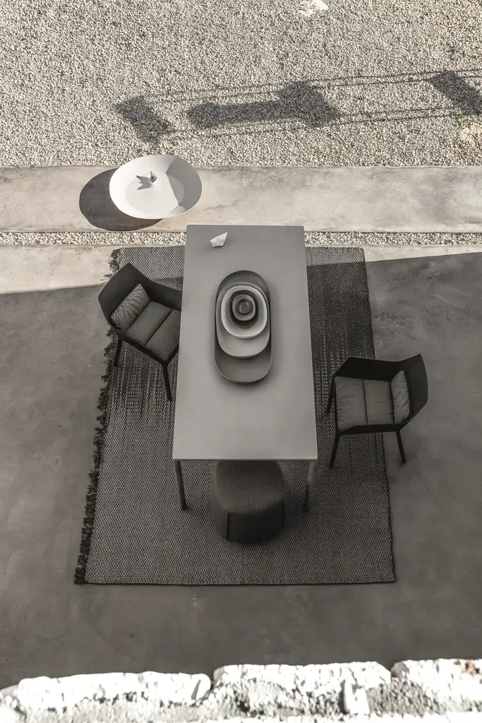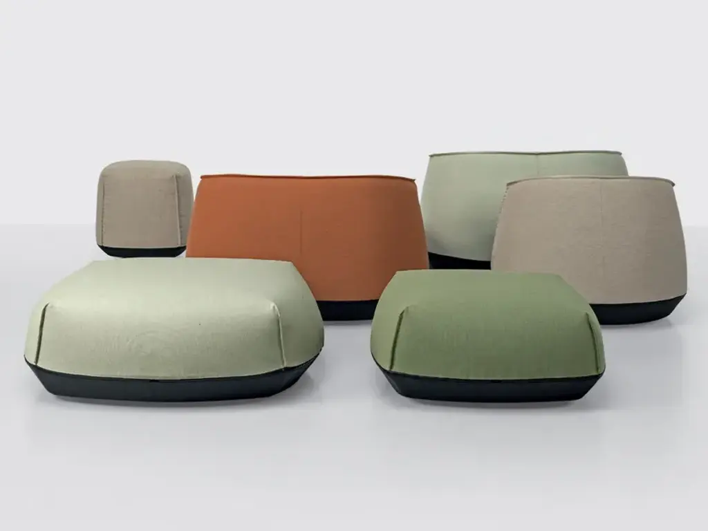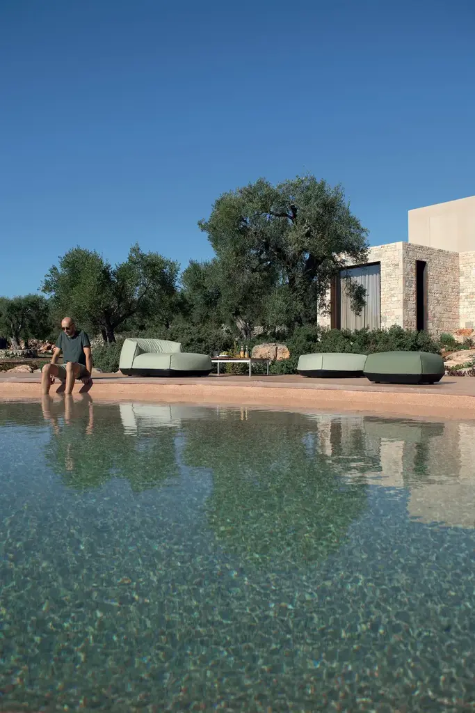 Brioni is a collection of poufs, lounge armchairs and daybeds named after a famous archipelago in the Adriatic Sea. They resemble small islands rising out of the sea.Their design features a dark band on the lower part that prevents direct contact between the ground and the upholstery. The upholstery is made of Sunbrella® fabric: stain-resistant, breathable, resistant to UV rays and water-repellent. They are soft and comfortable thanks to flexible polyester padding and plastic slats, enclosed in water-resistant housing. Light and easy to move, they can be used to create countless compositions outdoors, experimenting with different shapes, colours and sizes.