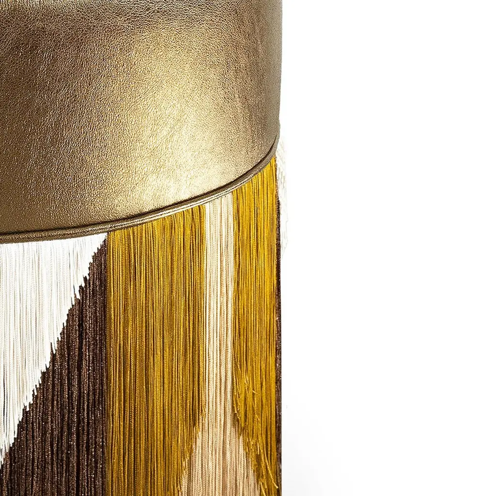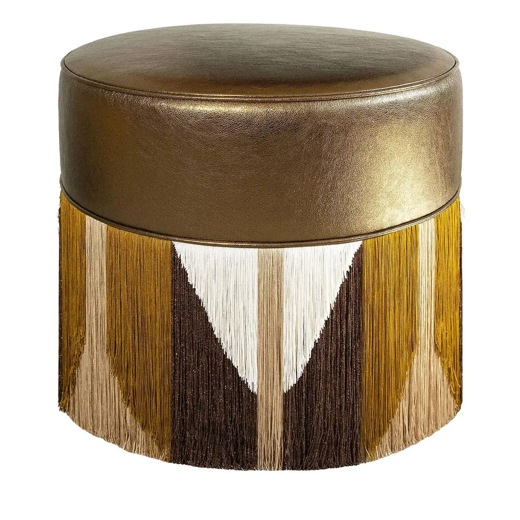 An elegant round pouf with a 50 cm diameter, fully upholstered in metallic bronze leather that captures and reflects light with sophisticated dynamism. Its design features geometric fringes inspired by the iconic Tribe motif, crafted in a subtle tone-on-tone effect that enhances the pouf’s refined, textured appearance. The interplay between the shimmering leather and the intricate fringes creates a striking visual and tactile contrast, giving the piece a bold yet versatile character. Ideal as an additional seat or a statement accent in contemporary or eclectic interiors. Each bespoke piece is stamped on the bottom of the pouf’s lining and personally signed, numbered, and dated by designer.