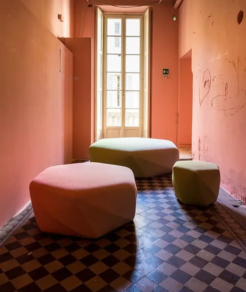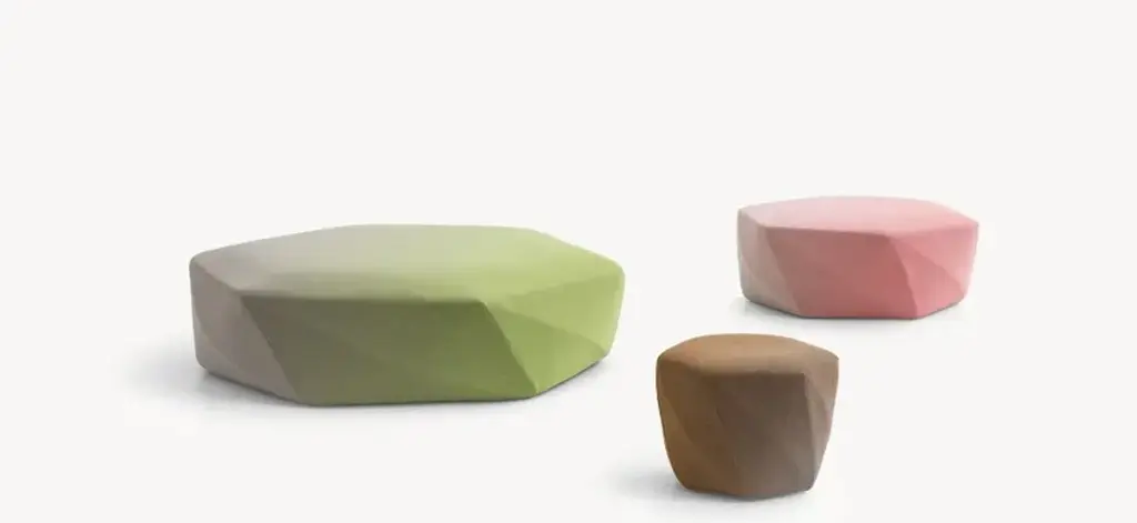 Designed originally for the new Issey Miyake flagship store in Brook Street in the heart of London’s Mayfair, Brook is an upholstered ottoman with a faceted profile where the cuts, designed as a function of the textile covers, bring to mind precious stones. In the seats however there is no refraction, no light. The name, as well as referring to the address of the London store, suggests the image of a brook evoking the idea of a river stone, moulded and shaped by the action of the water. A refined symmetry derived from observation of nature and the integration of its laws in the very act of designing.Injected flame-retardant polyurethane foam over internal steel frame; on clear PVC glides. Fabric covers only; not produced in leather. Brook covers are removable.