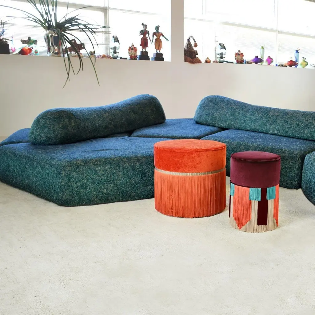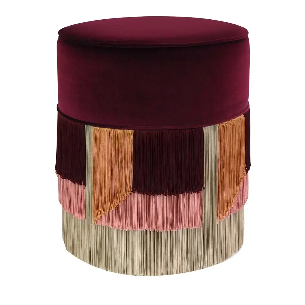 Drawing inspiration from neckties, this pouf from the Couture Geometric Collection features a clever viscose fringe design in orange, teal and burgundy. Sitting on a beechwood base, the stool is topped with lush velvet upholstery. Pair the piece with others from the collection to create an unexpected lounge area.