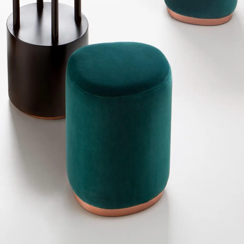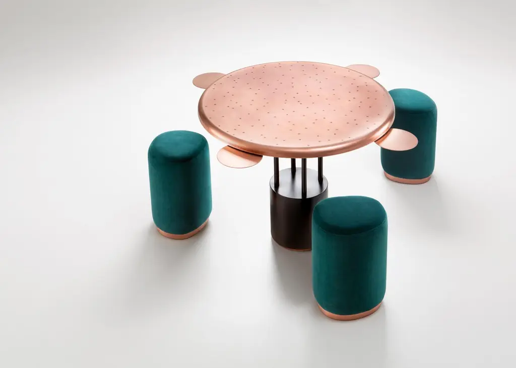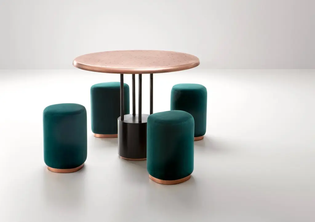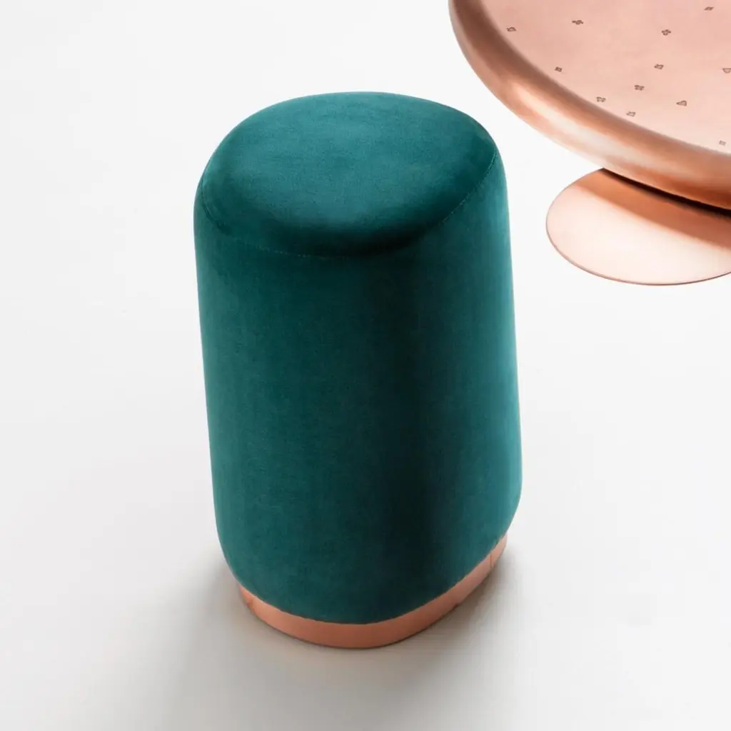 Burraco Pouf by De CastelliDimensions: W 37 x D 34 x H 44 cmMaterials: Brushed Copper, OtherThis games table is a throwback to yesteryear with a refined allure, which takes on a whole new value as we find ourselves with increased leisure time at home. The round table top in natural copper is characterised by the distinctive DeErosion finish, made even more special by the playful inclusion of the suits of the different playing cards. Four small serving trays can be extracted from beneath the table top when needed, for placing playing cards or a glass. The table is rounded off with four organically-shaped stools, featuring a copper base and seat with velvet upholstery.DE CASTELLI“HARD COUTURE”Faithful to its decision to reinstate the special role of metal in design and experimentation, De Castelli infuses artisan ideas and workmanship into industrial processes, leading to entirely original results. The encounter with design inspires an approach to materials founded upon respect for their potential, be it hidden or obvious, which emerges slowly in a collection of pieces that, despite being part of a series, remain unique.Unique not only for the hand that has created them, but also for the singular cultural path that focuses on the aesthetic (and not just practical) value of the primordial material with which De Castelli shapes living spaces.A BESPOKE APPROACHEach object, even in the repetition of form, is a creative act in and of itself, one that incorporates a heritage of constantly-evolving expertise and research. The equation that relegates ‘cold’ metals to the margins of furnishing projects is thus overturned, bringing iron, brass and copper, in their infinite variations and finishes, to the centre of an entirely renewed stage, allowing them to finally shine with their own light.SUSTAINABILITYDe Castelli has always been committed to making the entire production cycle increasingly sustainable, aware that metal, the material with which its business identifies itself, is precious and must be treated with care, without waste.PEOPLE FIRSTThe wide spaces of the De Castelli headquarters in Crocetta del Montello (TV) allow those who work to enjoy environments where order, cleanliness and safety are always maintained and guaranteed. An attitude of attention and respect for people that has led to the shared ethical code.
