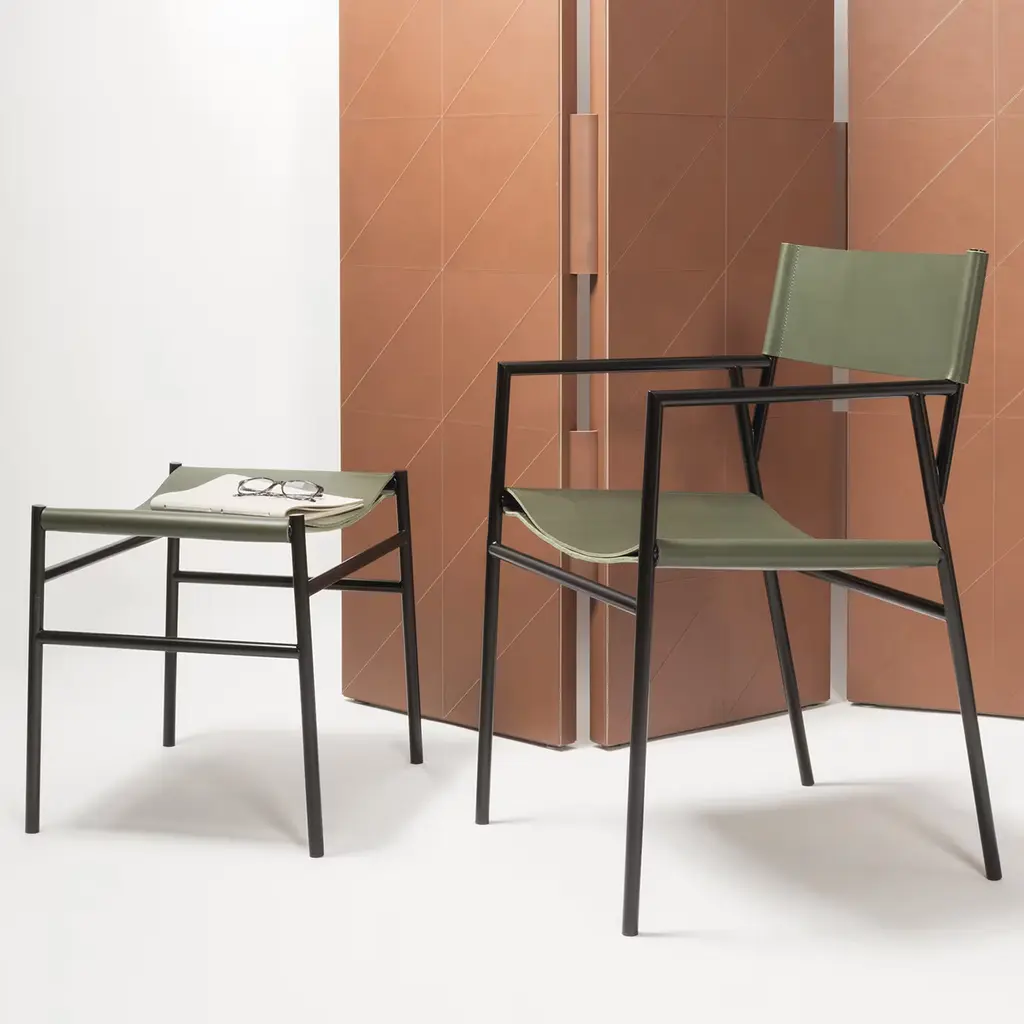 A pouf made of two folded sheets of saddle leather and a metal frame designed to adapt perfectly to the body: that's Caballè pouf, created to ensure you the maximum comfort. The Rabitti 1969 products are made with vegetable tanned saddle leather; its waterproof finish doesn't loose its features nor leaves color stains if gets wet.