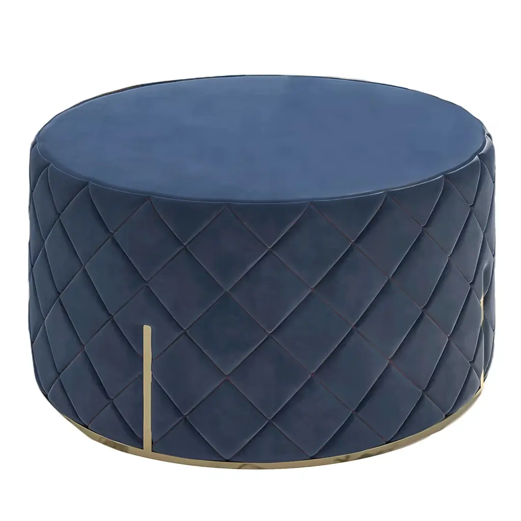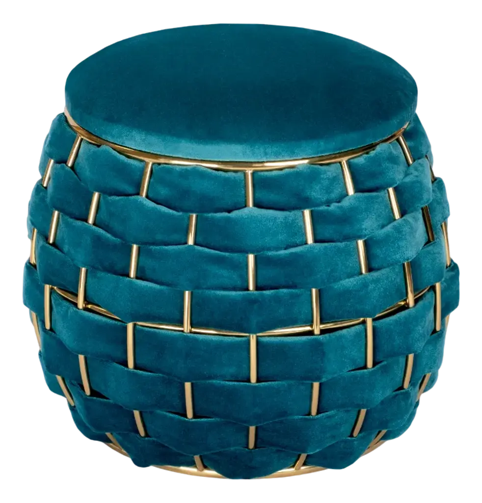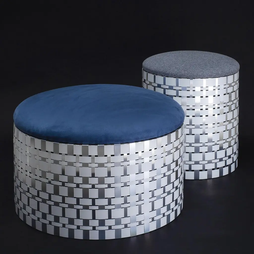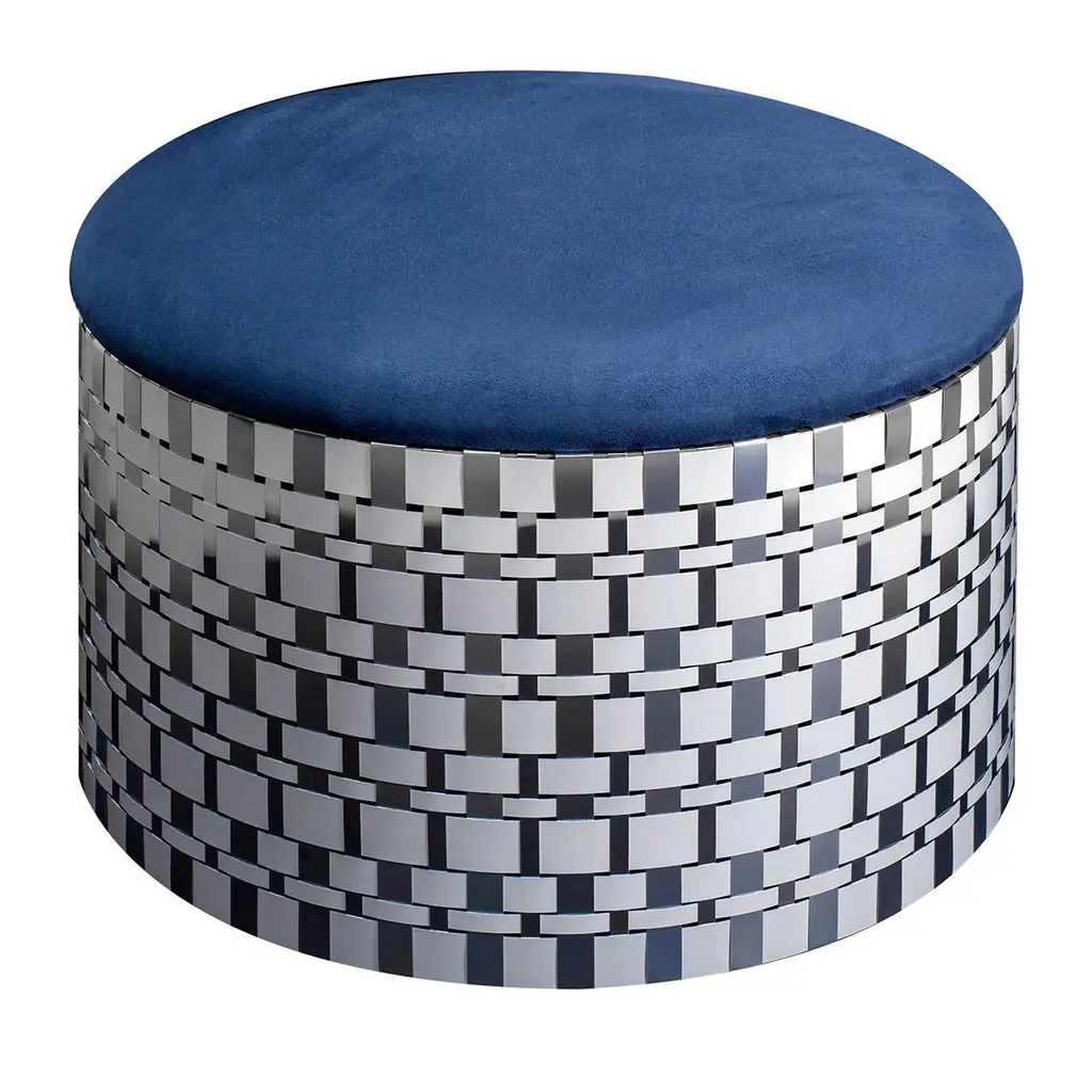 Part of the Pontoinaere Collection inspired by the traditional Venetian lace, this pouf is named after a renowned "piazza" (square) of Venice. Boasting a round seat upholstered with blue Alcantara, it features a cylindrical aluminum base displaying a sophisticated white and silver criss-crossed design. Please consult the Concierge for further details.