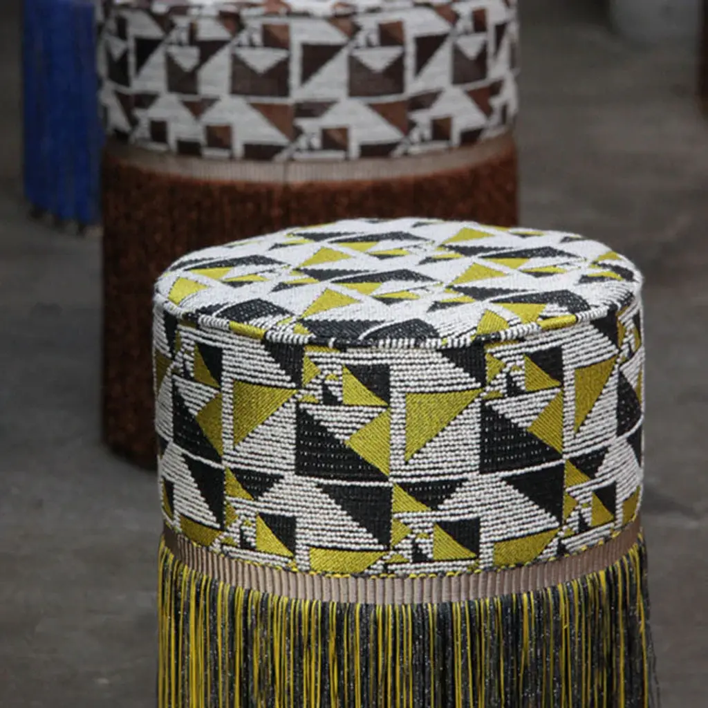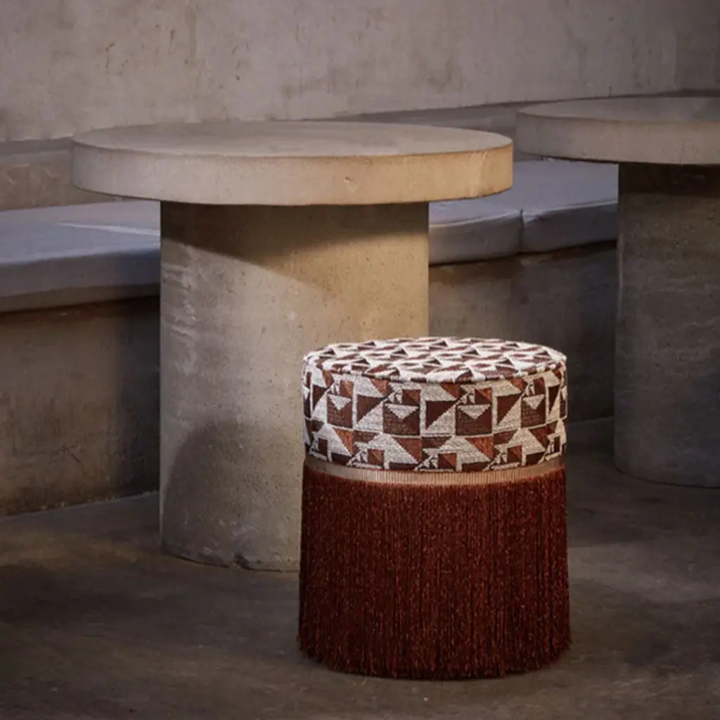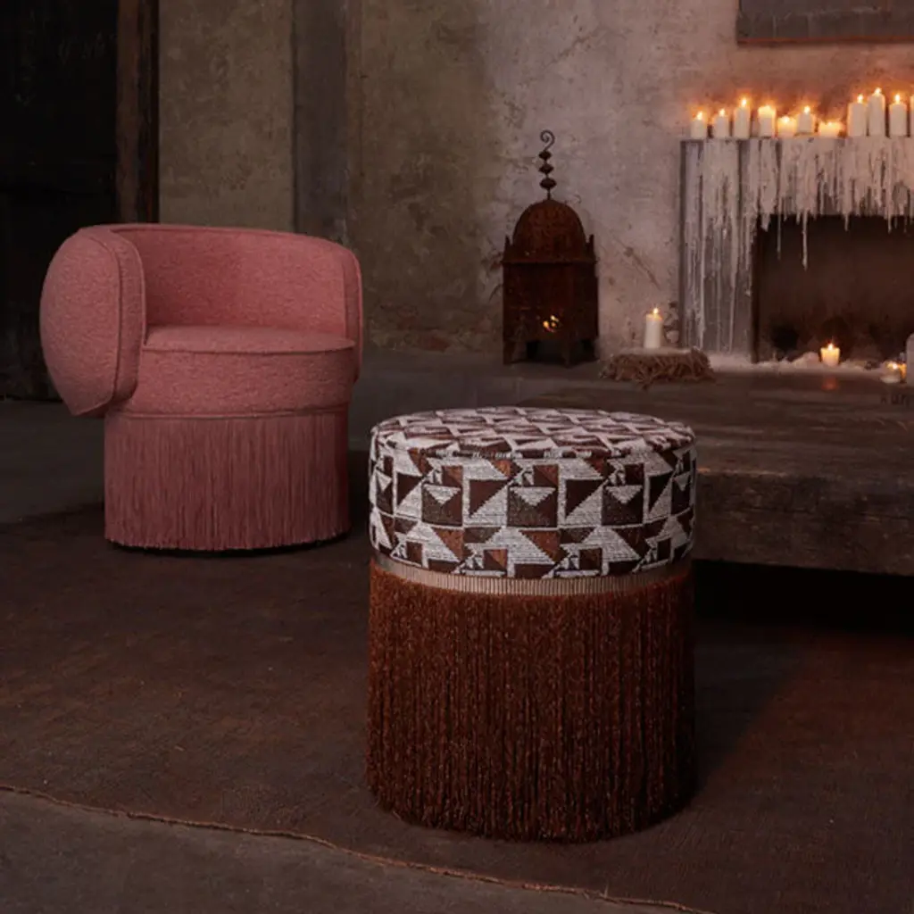 The Capsule Tribe Pouf is a study in luxe, bohemian elegance. Upholstered in retro, earth-toned fabric, it features a floor-length fringe skirt of viscose and lurex that shimmers with movement as it catches the light. Crafted on a solid beech wood frame, each pouf is handmade in Milan and signed & numbered by Lorenza Bozzoli, underscoring its exclusivity. This luxury fringe pouf is both a functional seat and a sculptural statement—perfect for adding fashion-forward texture and intrigue to any modern interior. Features