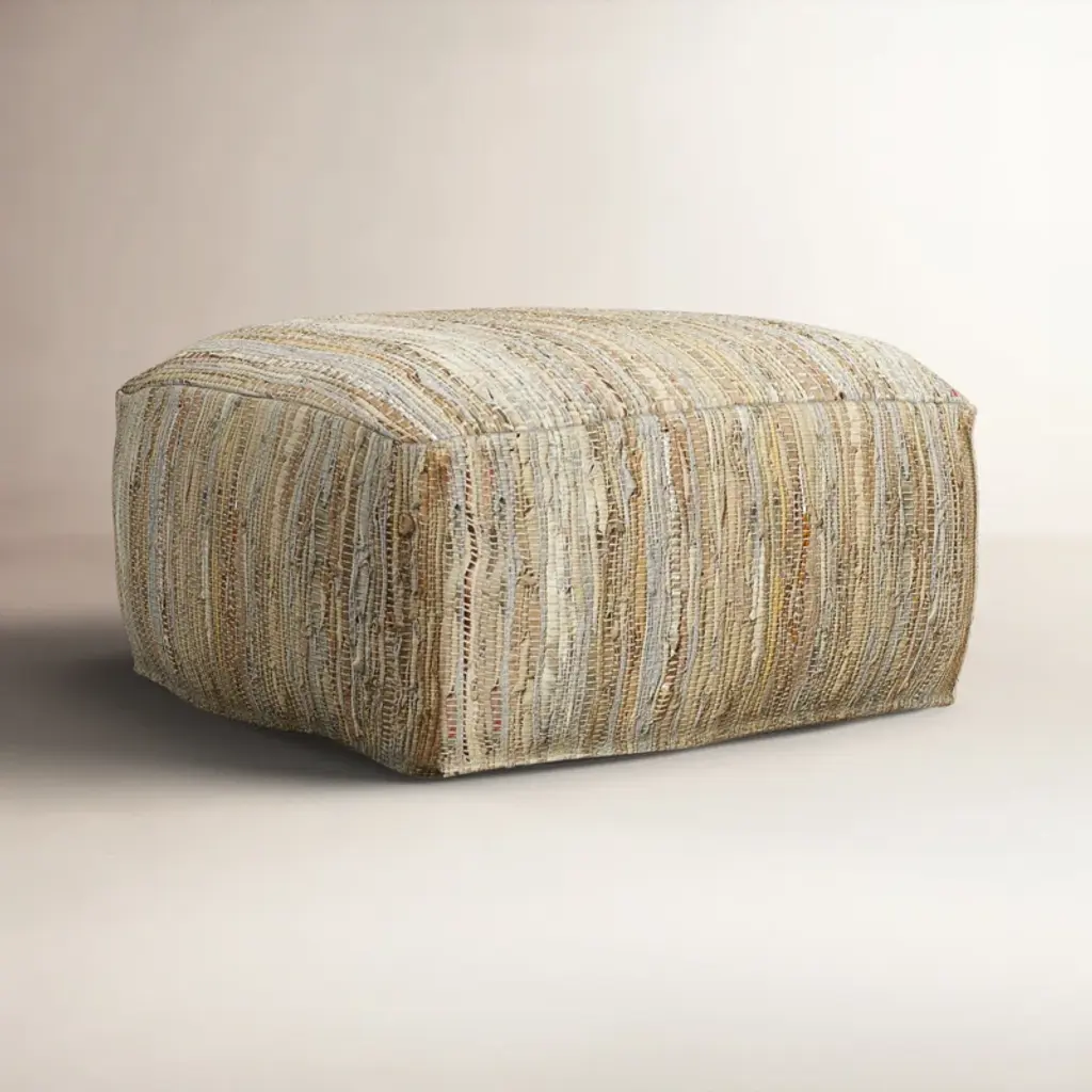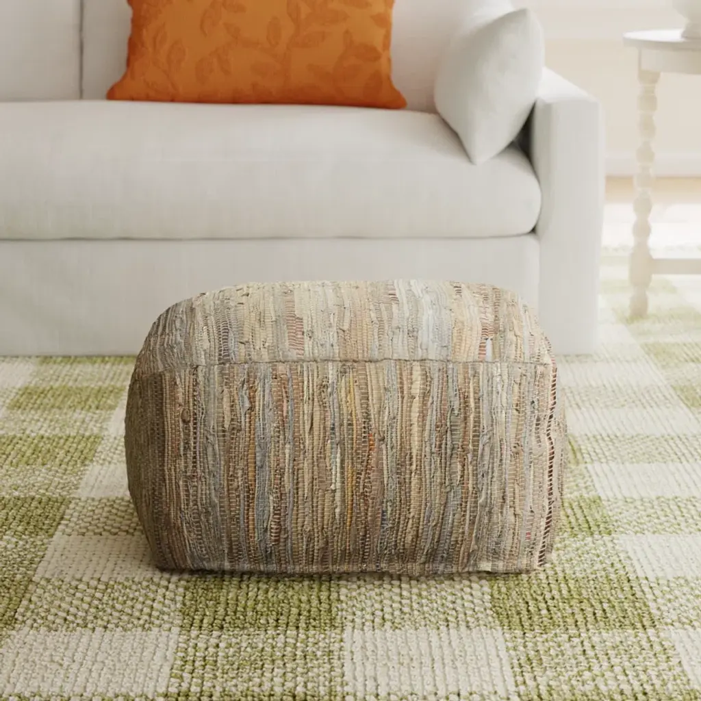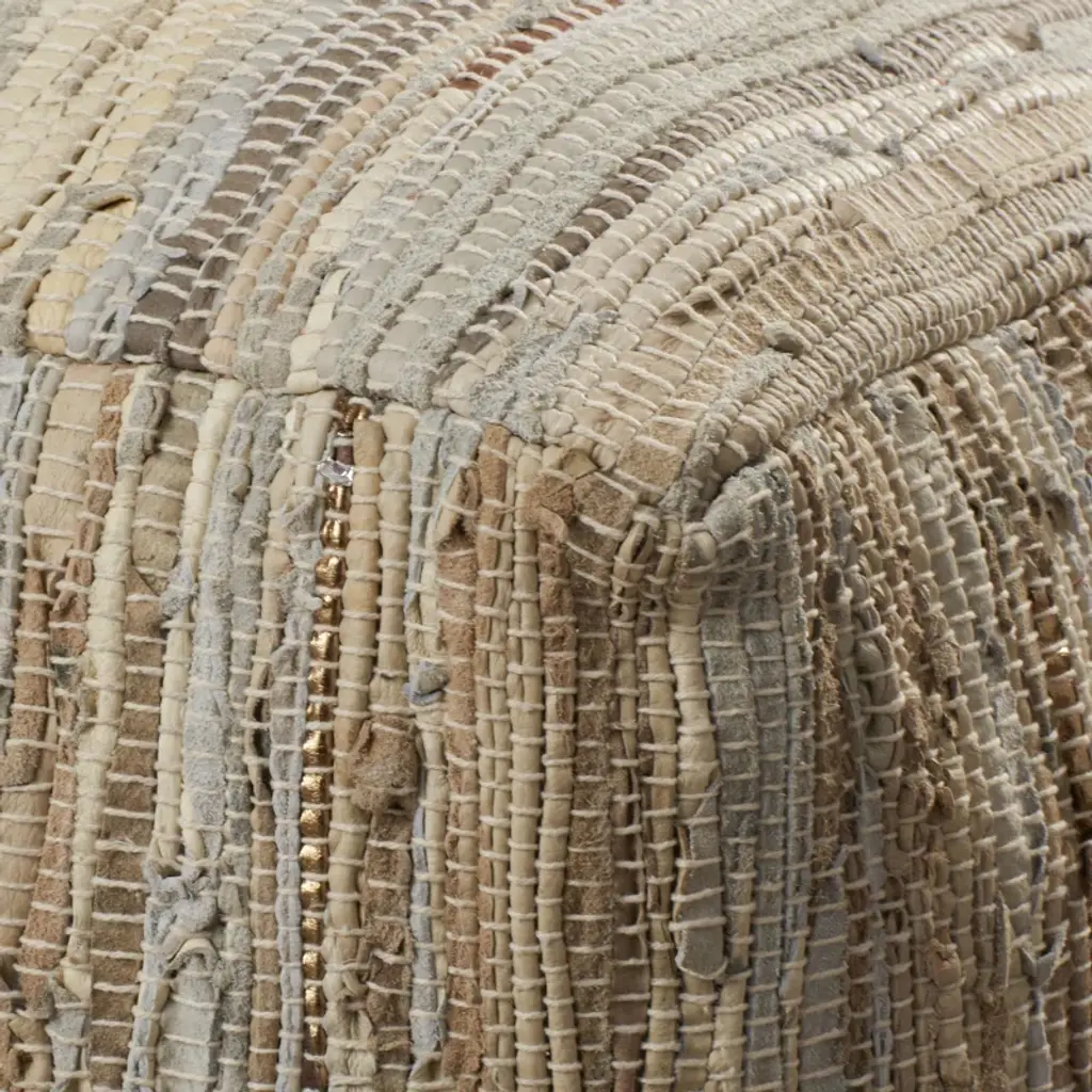 There is nothing like a pouf ottoman to add personality and fun to your space. This one is covered with 100% genuine leather that has a highly textured woven look in light neutral colors. We love how leather softens with age, so this square pouf is likely to have a place in your home for a while. It has a polyester fill and is well-suited for a variety of purposes: As an extra seat or footrest in your den or as a surface for a tray of snacks in your living room.