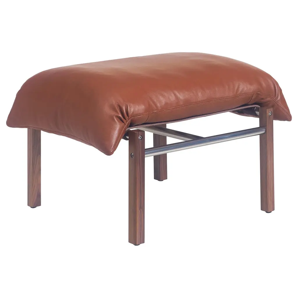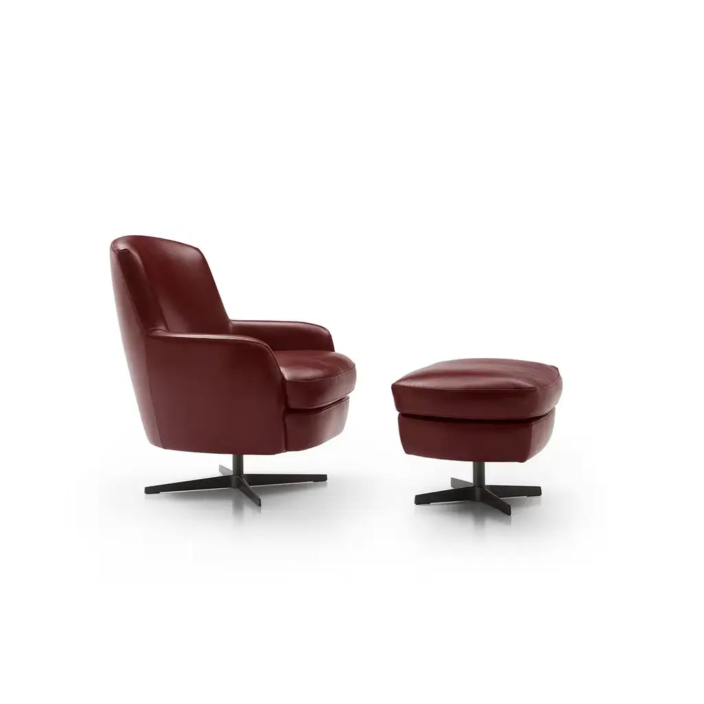 Modern functionality and classic elegance define this pouf that will complement the Carol armchair in any living room or study, both modern and classic, as a footrest or additional seating. Following the same style, the square wooden frame is padded with polyurethane foam and covered with a sophisticated full-grain leather in a dark burgundy-red color (Classic Extra Luxury col. 803). The base features four metal spokes finished in polished bronze that allow a full 360-degree rotation while adding an elegant-retro flavor to this stunning piece of functional decor.