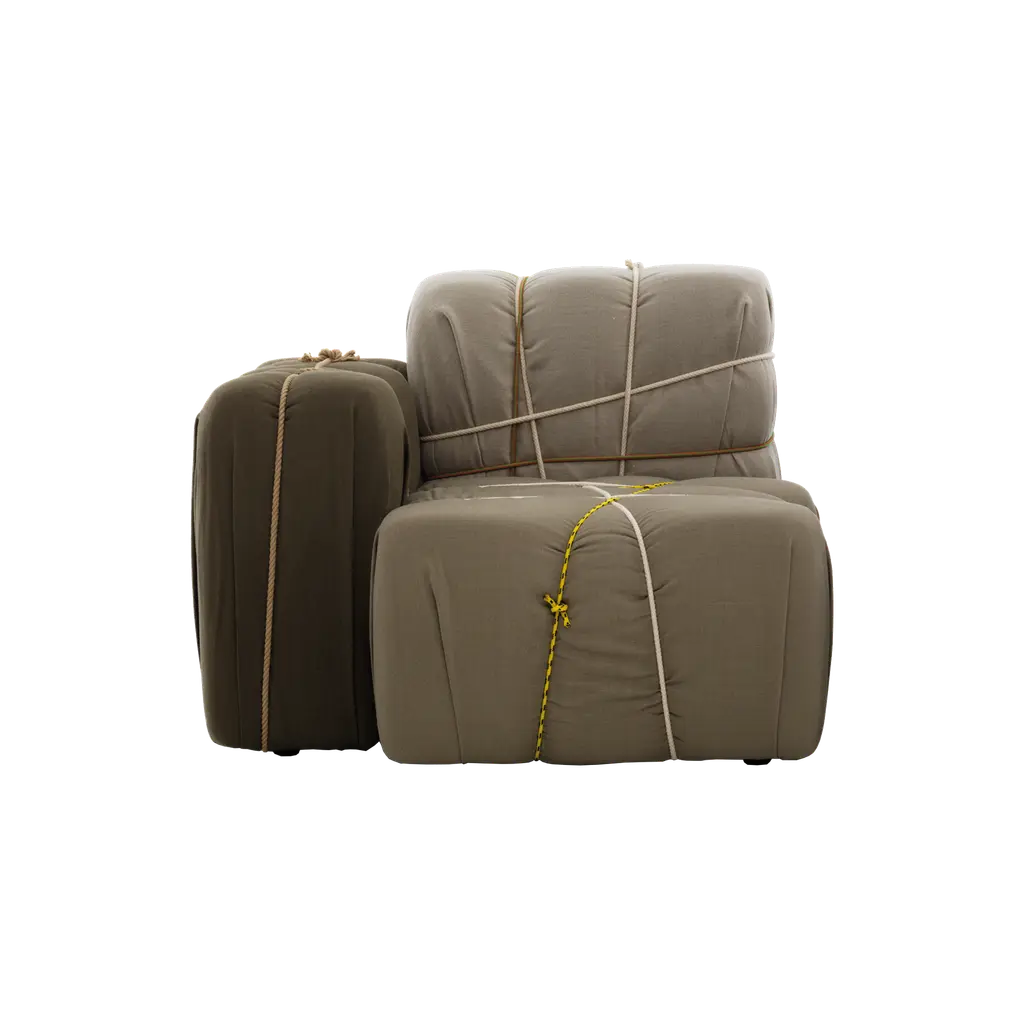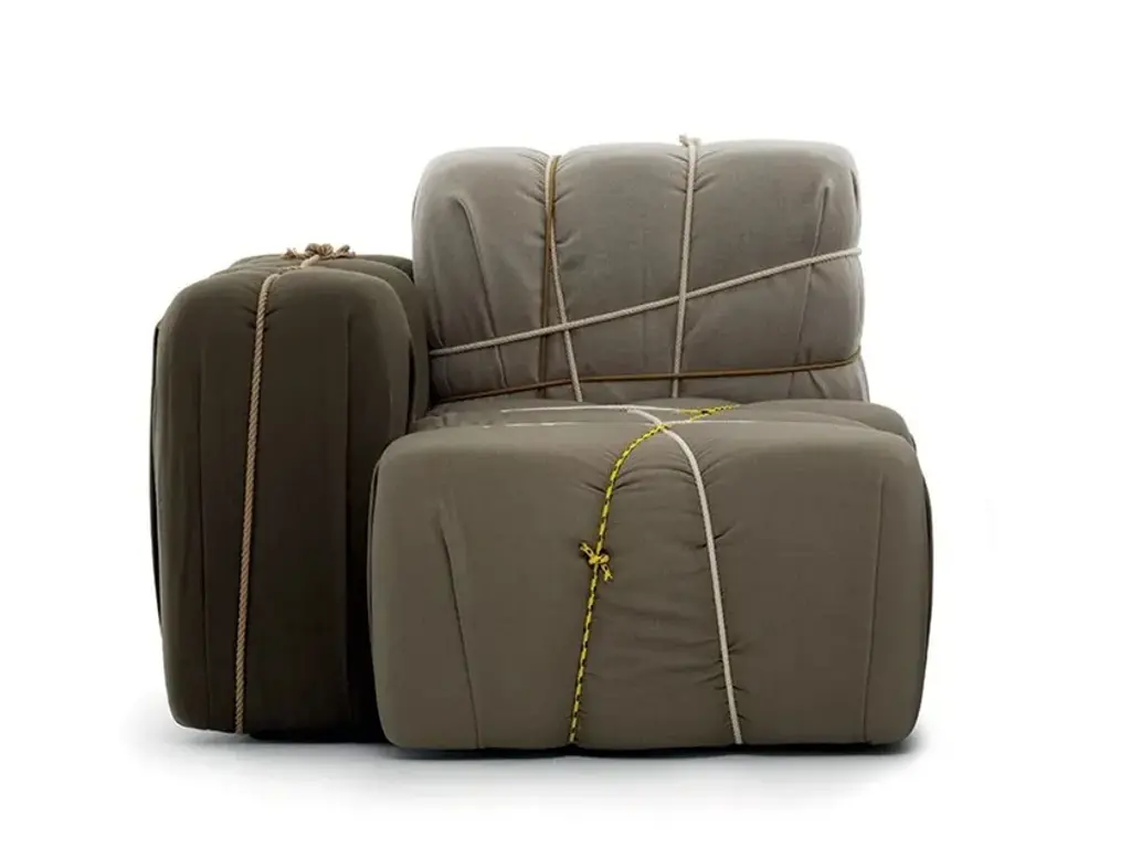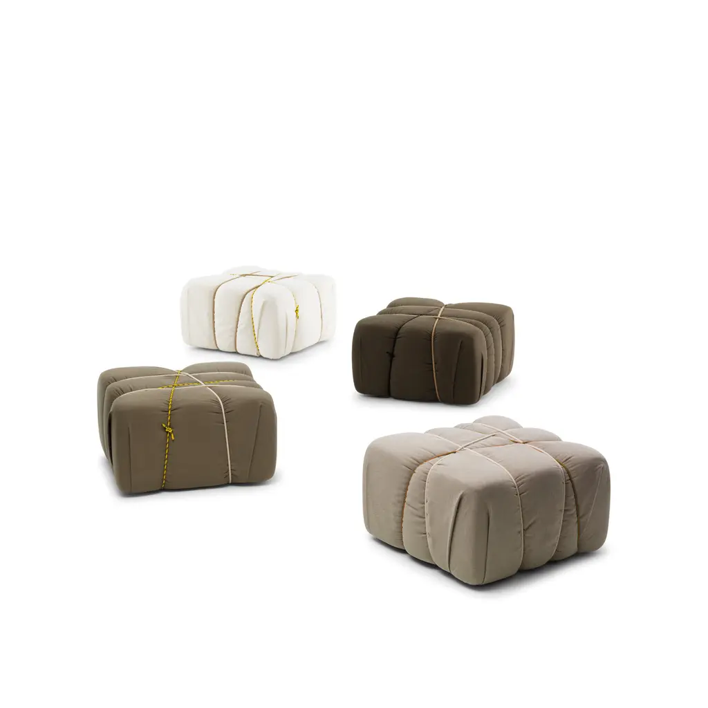 Che Pakko is an upholstered ottoman with non-removable cover. Available in 4 colors matching decorative ropes. Che Pakko is an ottoman that takes inspiration from the old packed boxes enclosed and bounded by ropes. Comfortable and playful it will suit in any environment.