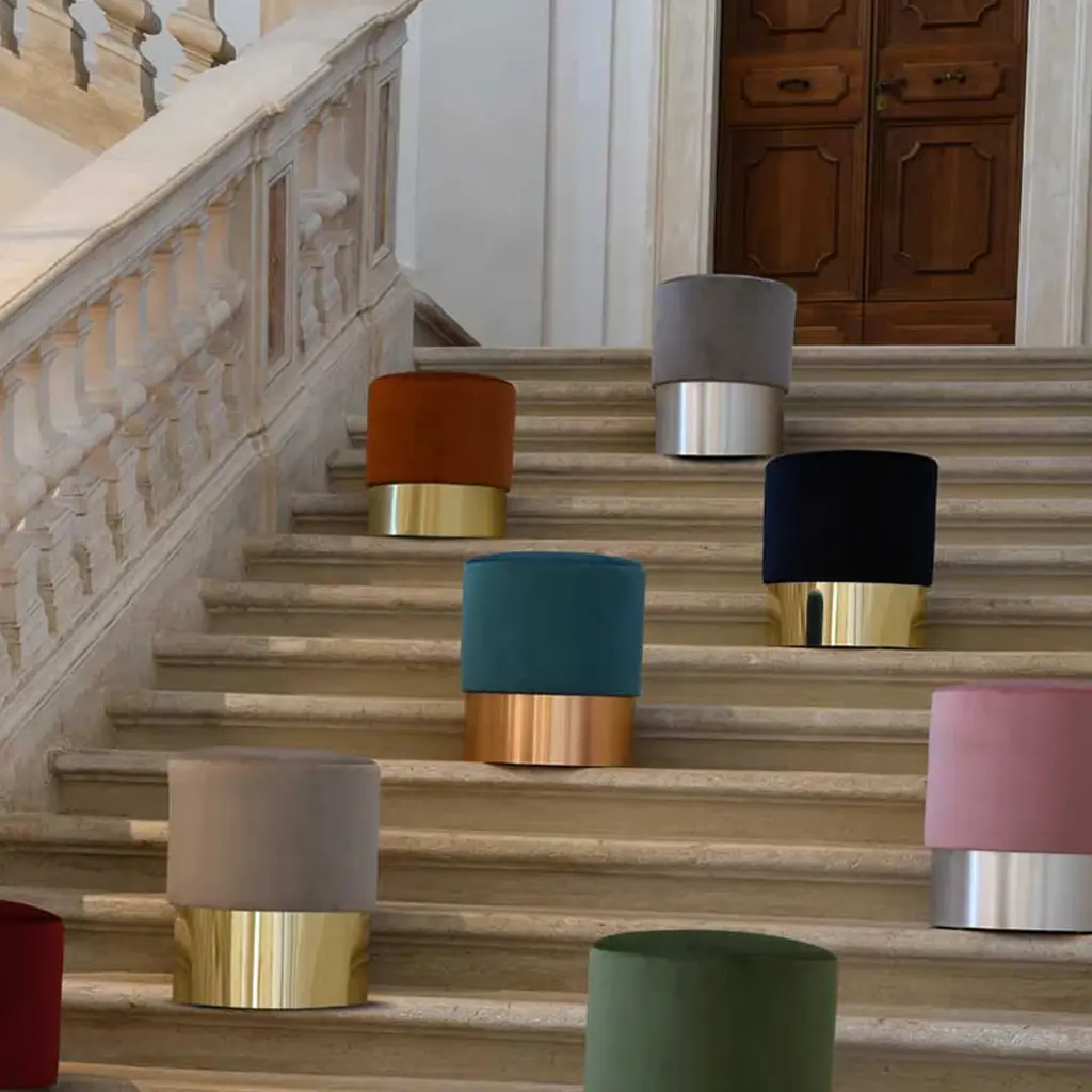 Restrained elegance and regal tones merge together to create this refined cylindrical pouf from the Chione Collection. The wooden structure rests on a laminate base boasting a luminous brass finish and featurs a generous padding covered in soft, midnight-blue velvet. Other finishes and colors are available, please contact the Concierge for details and pricing in these options.