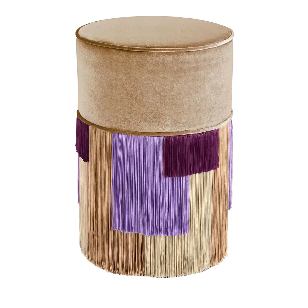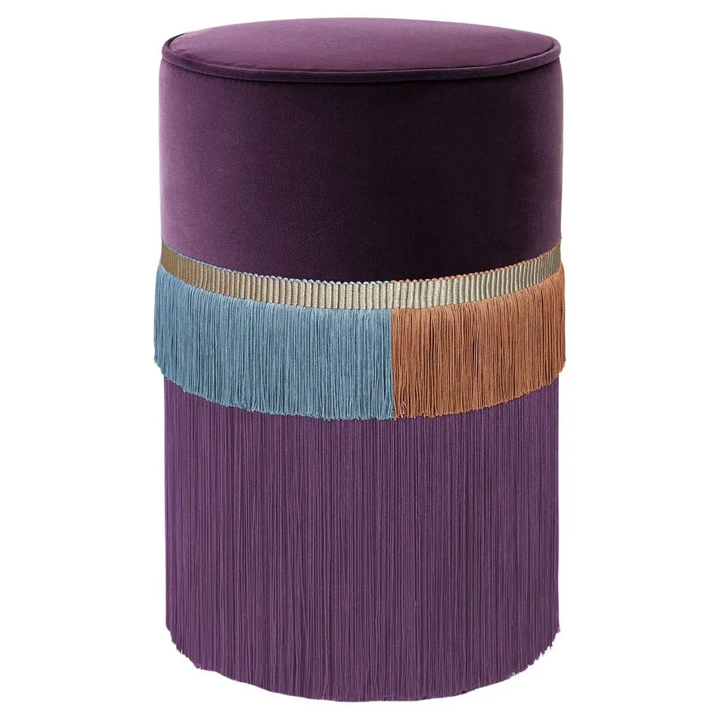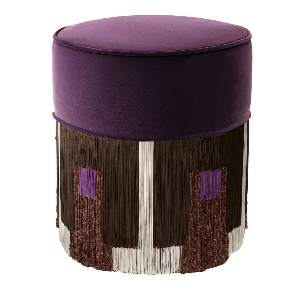 Vibrant hues and minute sartorial detailing borrowed from haute-couture catwalks merge in this beech pouf with exotic suggestions. Lurex and viscose fringes outline a tribal-inspired pattern throughout the base, its purple shades harmonizing with the seat's fine velvet cover with coordinated pipings. Generously stuffed, it is available in different colors upon request to the Concierge. Each bespoke piece is stamped on the bottom of the pouf’s lining and personally signed, numbered, and dated by designer.