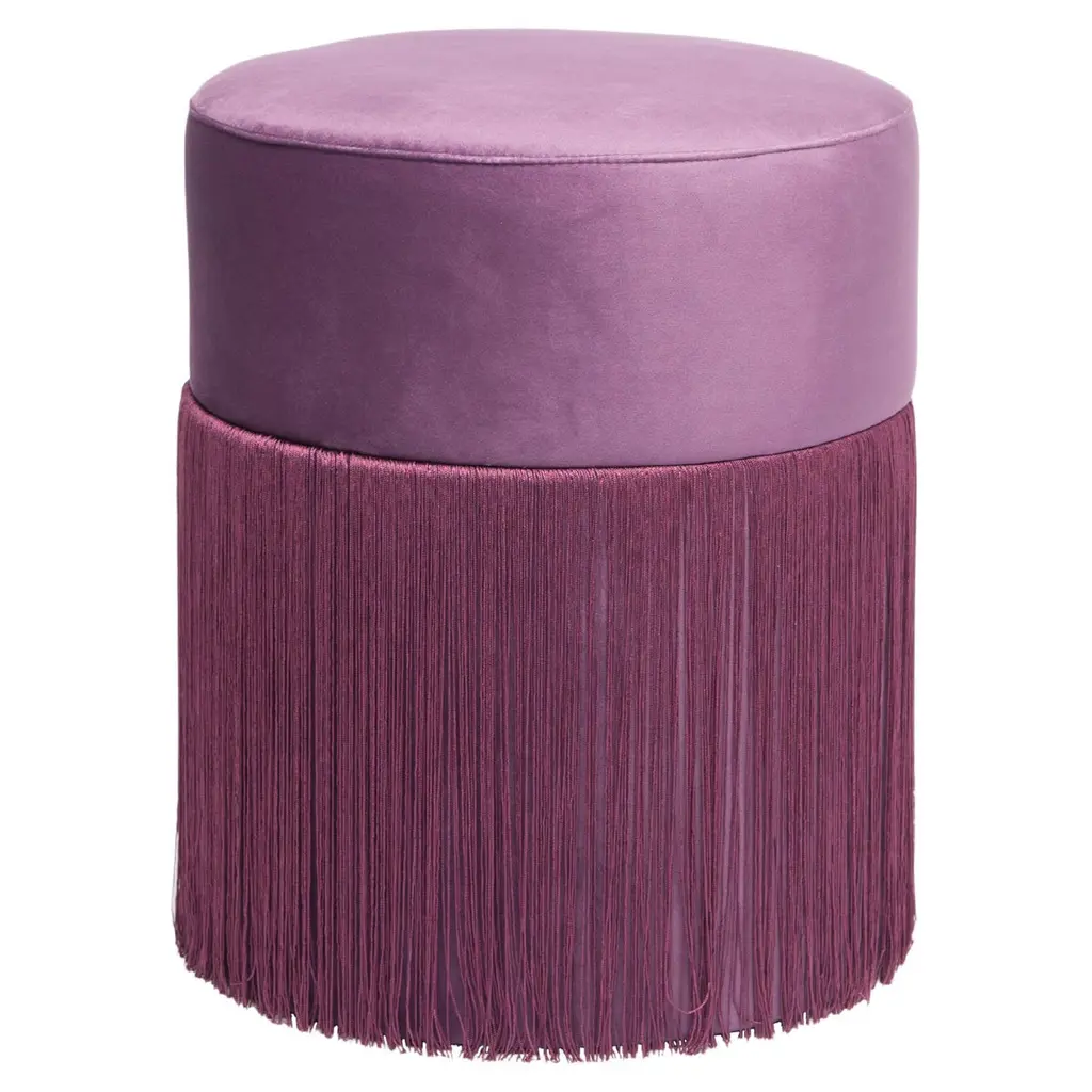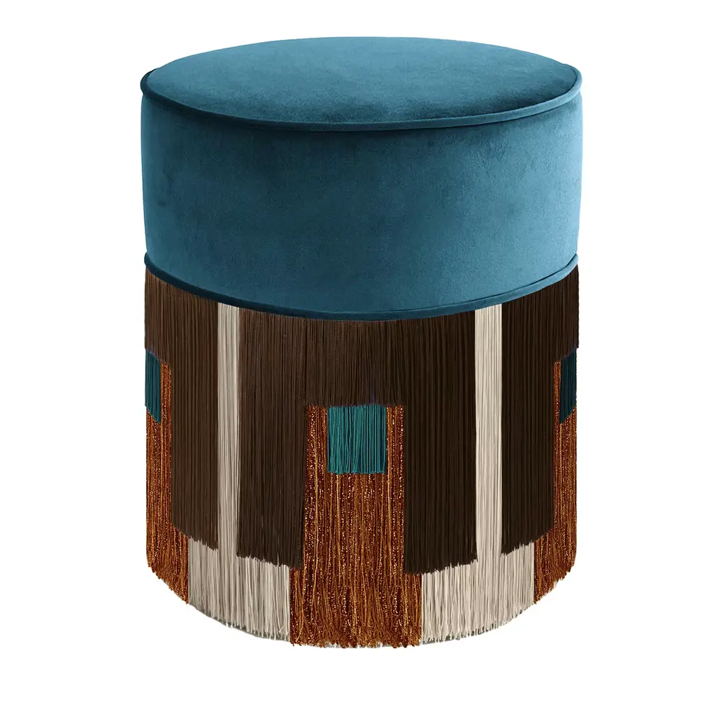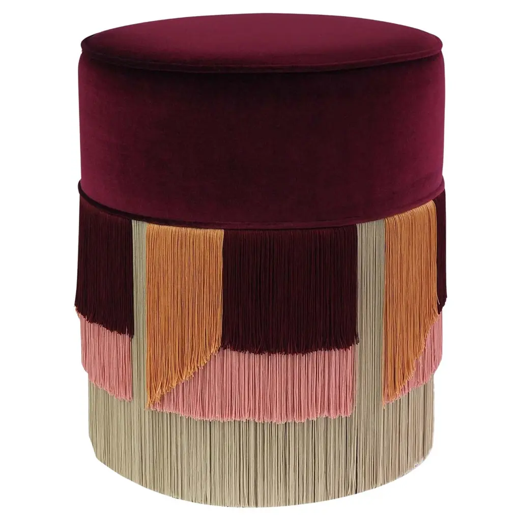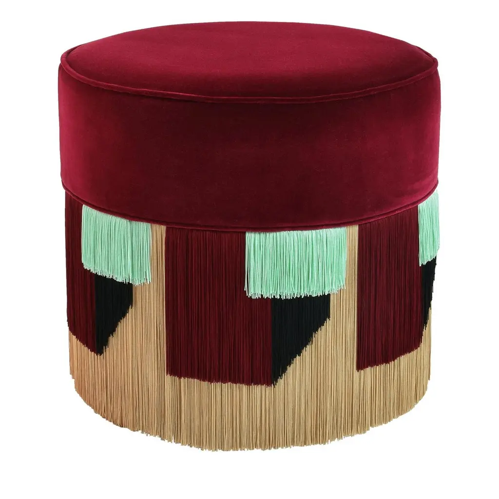 Vibrant hues and minute sartorial detailing borrowed from haute-couture catwalks merge in this beech pouf with exotic suggestions. Lurex and viscose fringes outline a tribal-inspired pattern throughout the base, its purple shades harmonizing with the seat's fine velvet cover with coordinated pipings. Generously stuffed, it is available in different colors upon request to the Concierge. Each bespoke piece is stamped on the bottom of the pouf’s lining and personally signed, numbered, and dated by designer.
