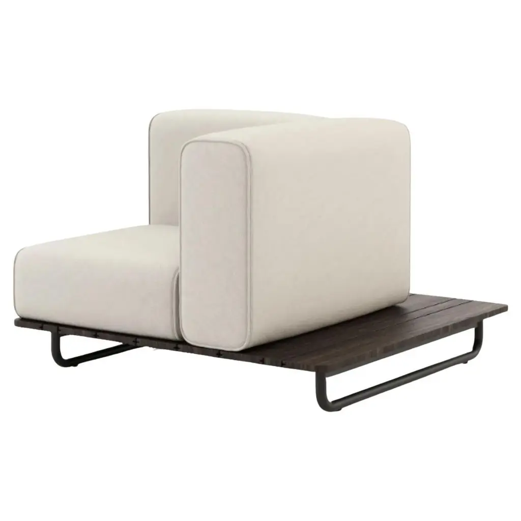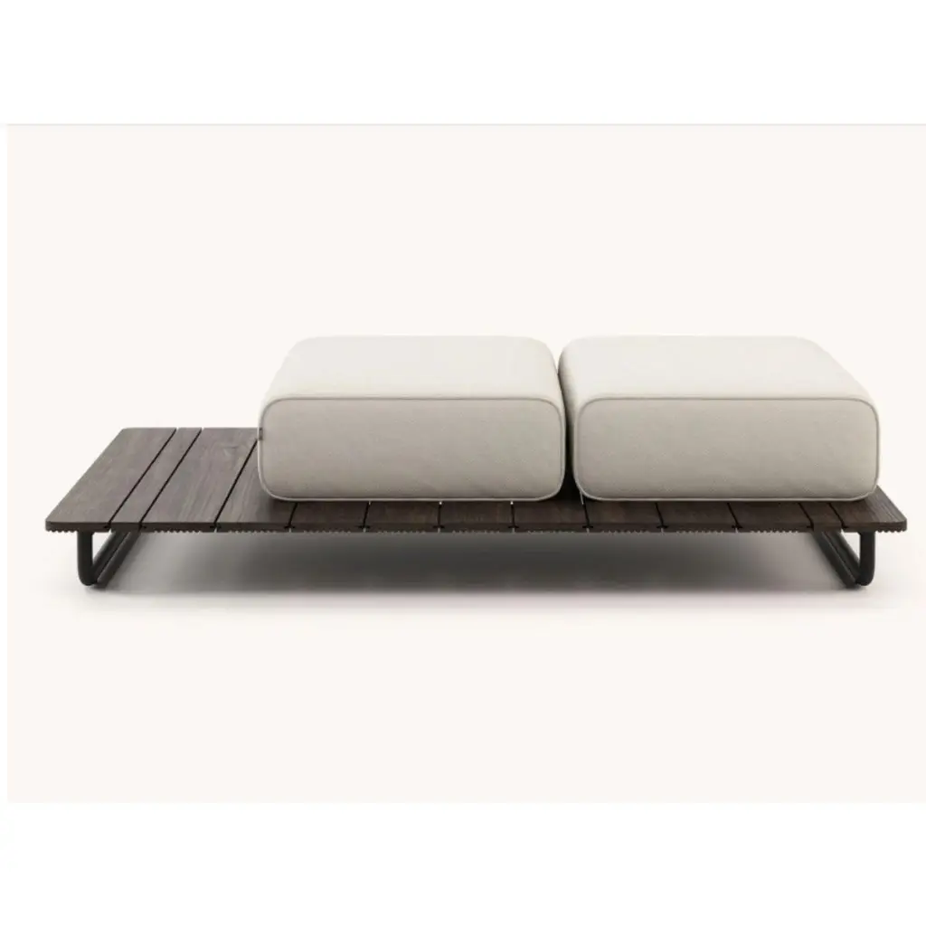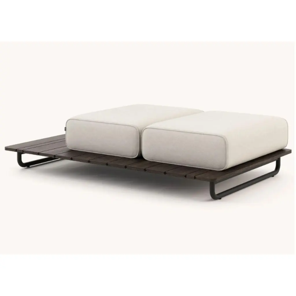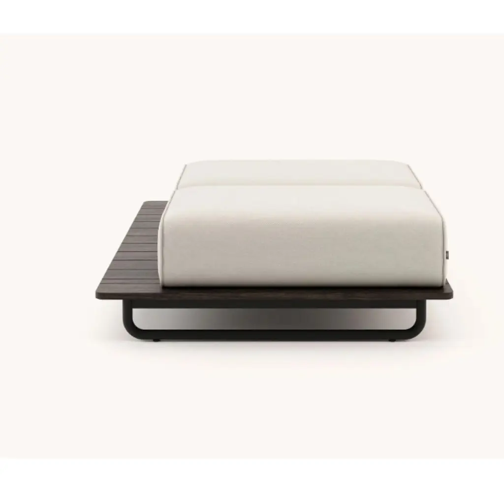 Copacabana pouf left by DomkapaMaterials: black texturized steel, bamboo wood, fabric (Rhine Ice).Dimensions: W 165 x D 105 x H 41 cm.Also available in different materials. Copacabana Pouf will occupy a special place in outdoor projects. Designed to be extra comfortable, this piece is one with beautiful hues.Domkapa holds a tremendous passion for detailed stitching, presenting several similarities to the haute-couture philosophy focused on the value of a “made by hand”. Based in Portugal, Domkapa was founded in 2009 as a Private Label. The long and fruitful path, full of experience and achievements inspired the brand’s new identity and independence, in 2017.Domkapa challenges its team to create the perfect daily meeting between design and comfort in each piece of the brand’s collections. Our design team works side by side with the production, and this organic synergy allows the creation of innovative designs.