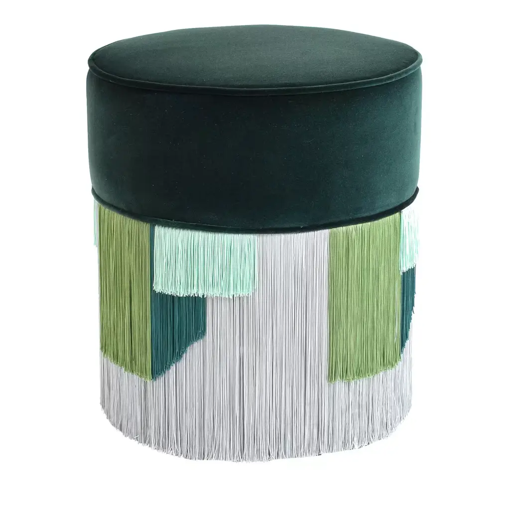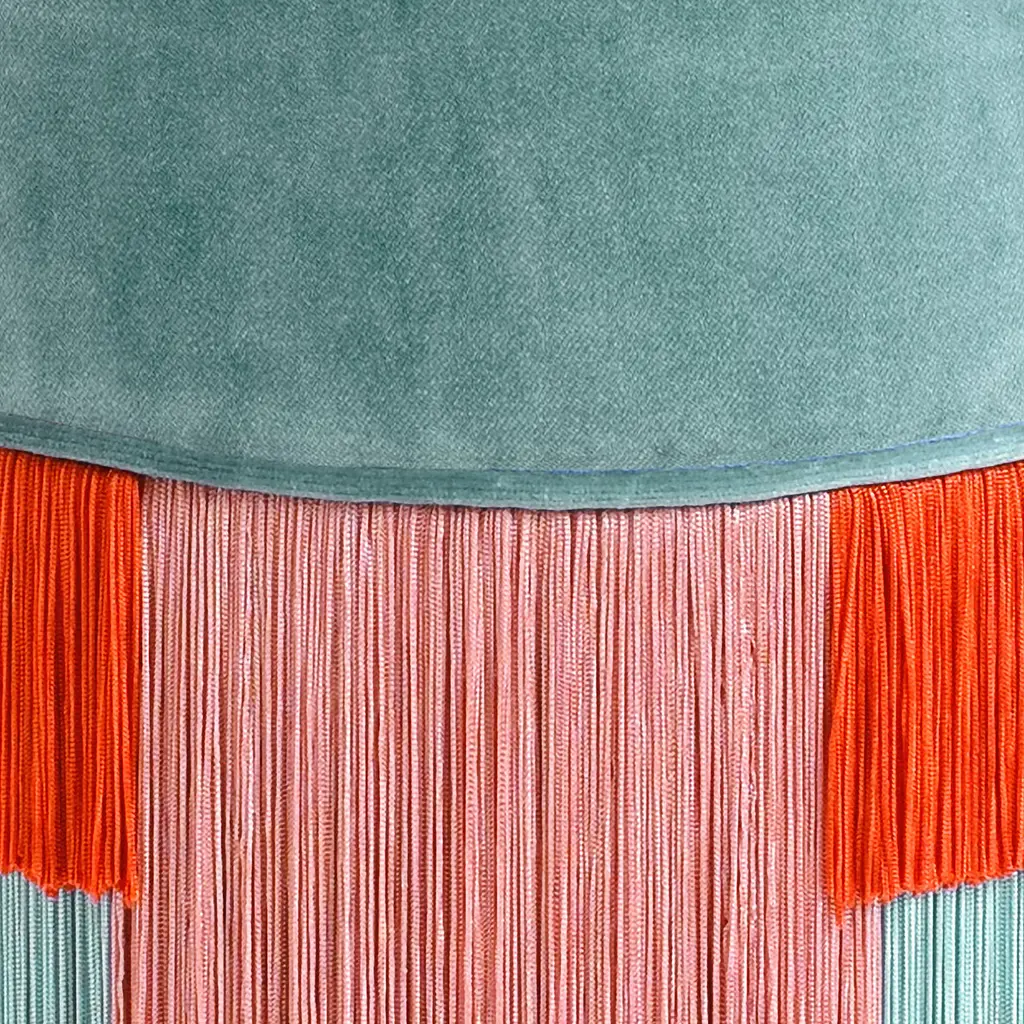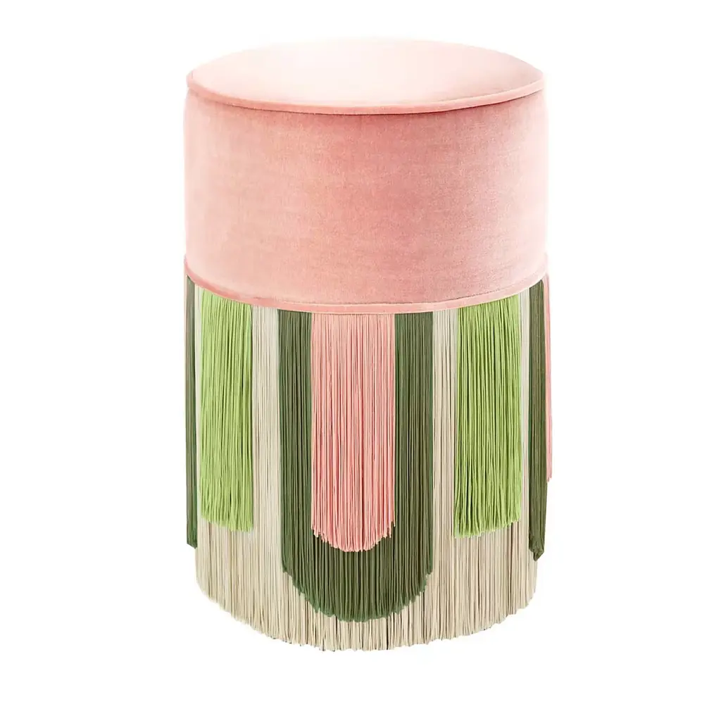 Marked by original design and vibrant colors, the tall and slender beech wood frame of this pouf supports the seat cushion, filled with synthetic padding and upholstered in a delicate light blue velvet for a long-lasting, soft feel. The bottom half boasts a geometric, block-color pattern recalling tribal motifs composed of hand-loomed and painted fringe. Layers of long light-blue fringes contrast with panels of bold pink fringe shaped as downward-pointing pentagons flanked by orange and black fringe, infusing the piece with dynamic movement and textural contrast. Each bespoke piece is stamped at the bottom of the lining of the pouf, signed, numbered and dated personally by the designer Lorenza Bozzoli. The original authenticity of each product highlights the artisanal quality and the art of a luxury dedicated design.