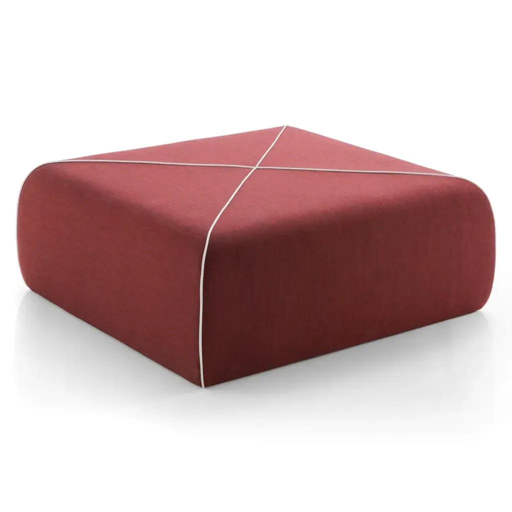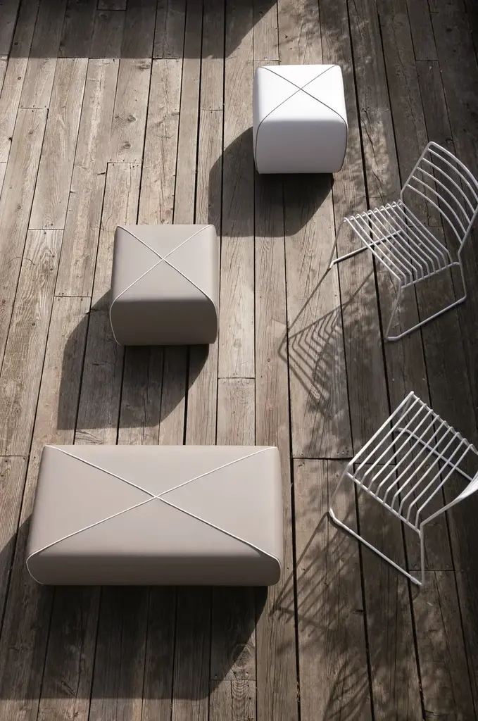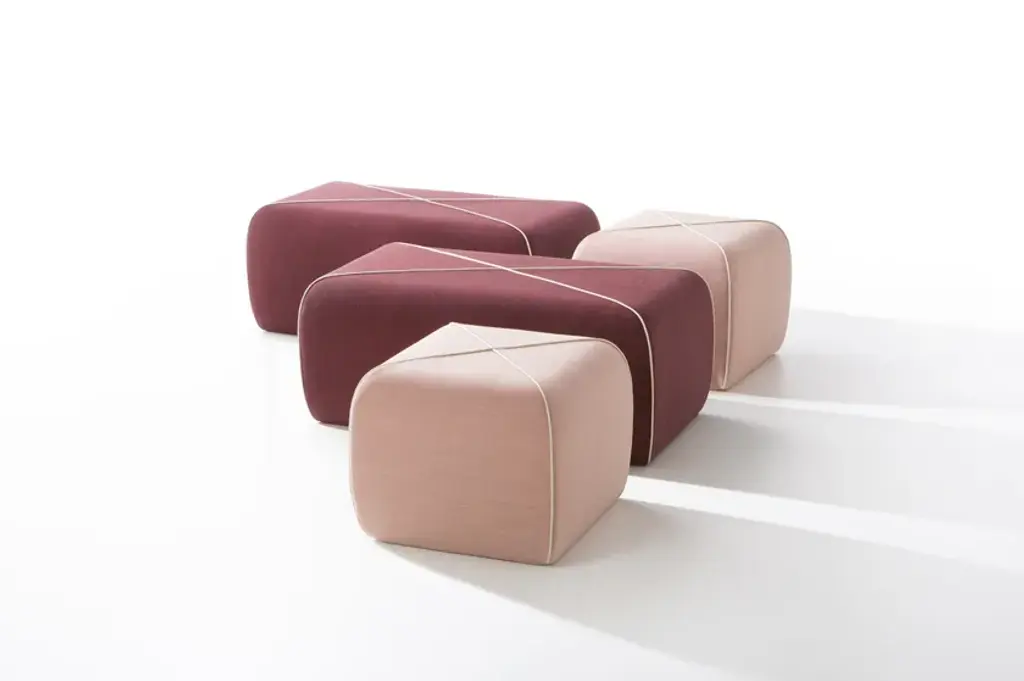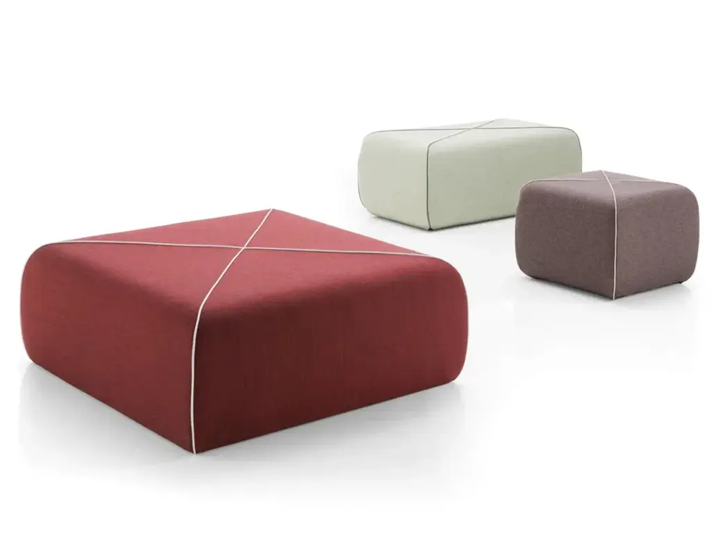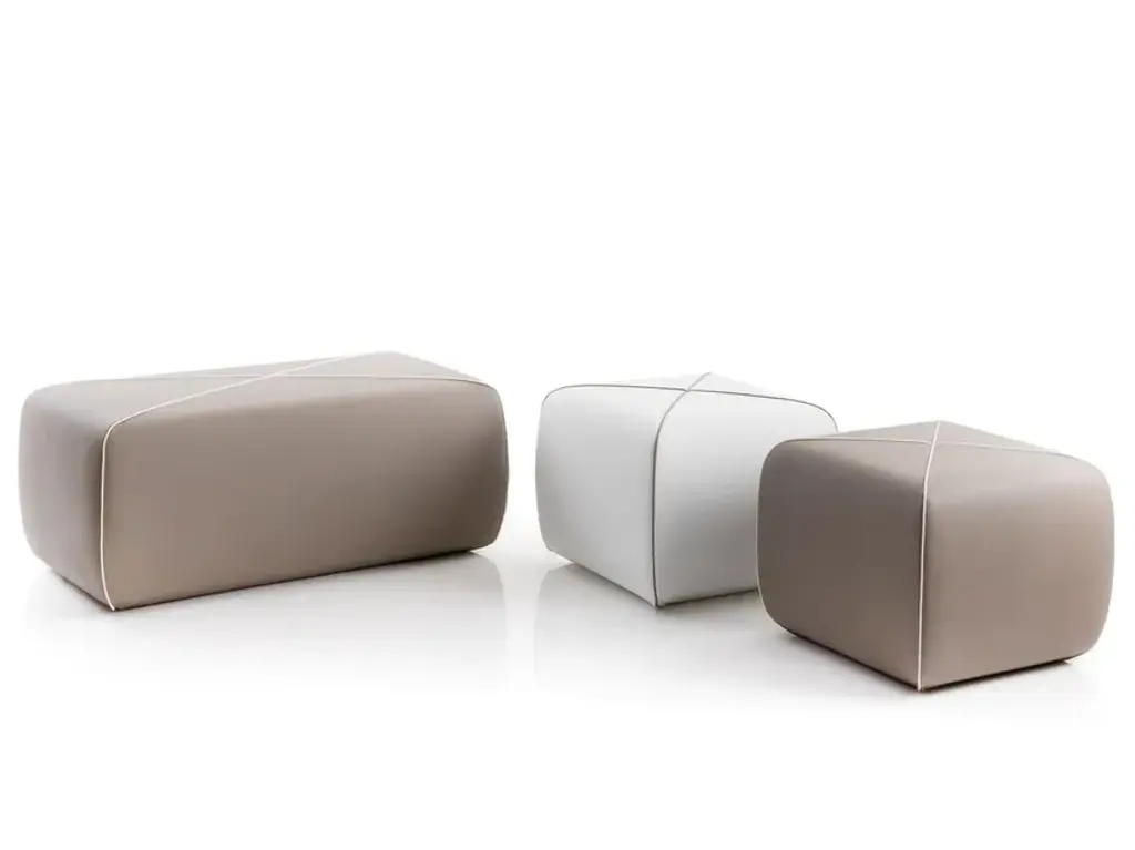 Crossed - Soft padded pouf with contrasting cross stitching available in two versions with square and rectangular bases that can be mixed and matched to create various shape and colour arrangements. Made of polyurethane foam upholstered in fabric or leather.