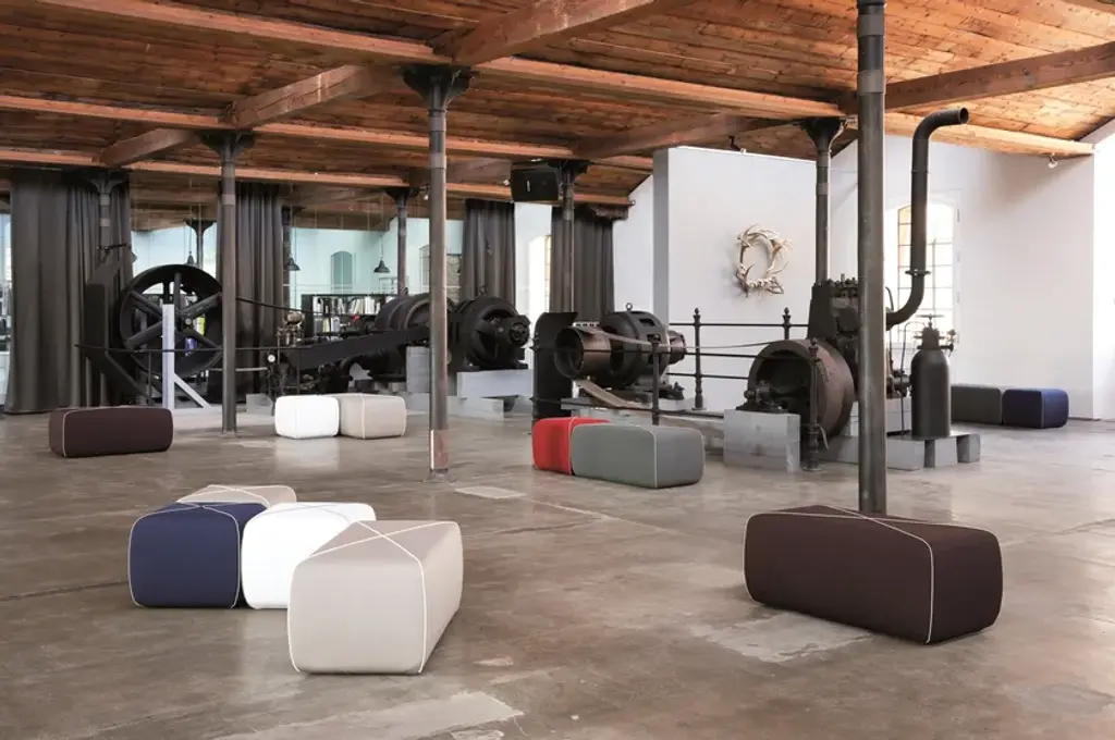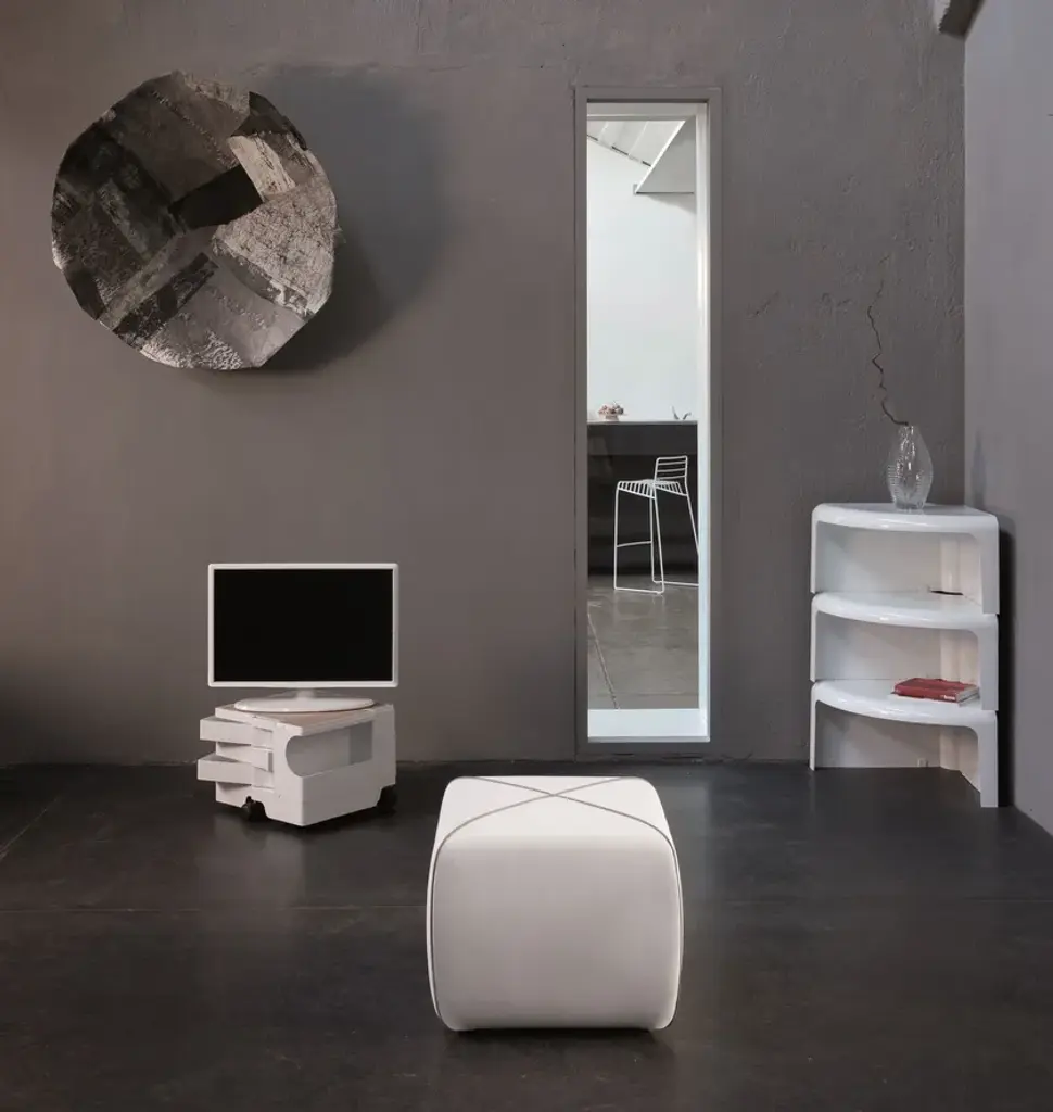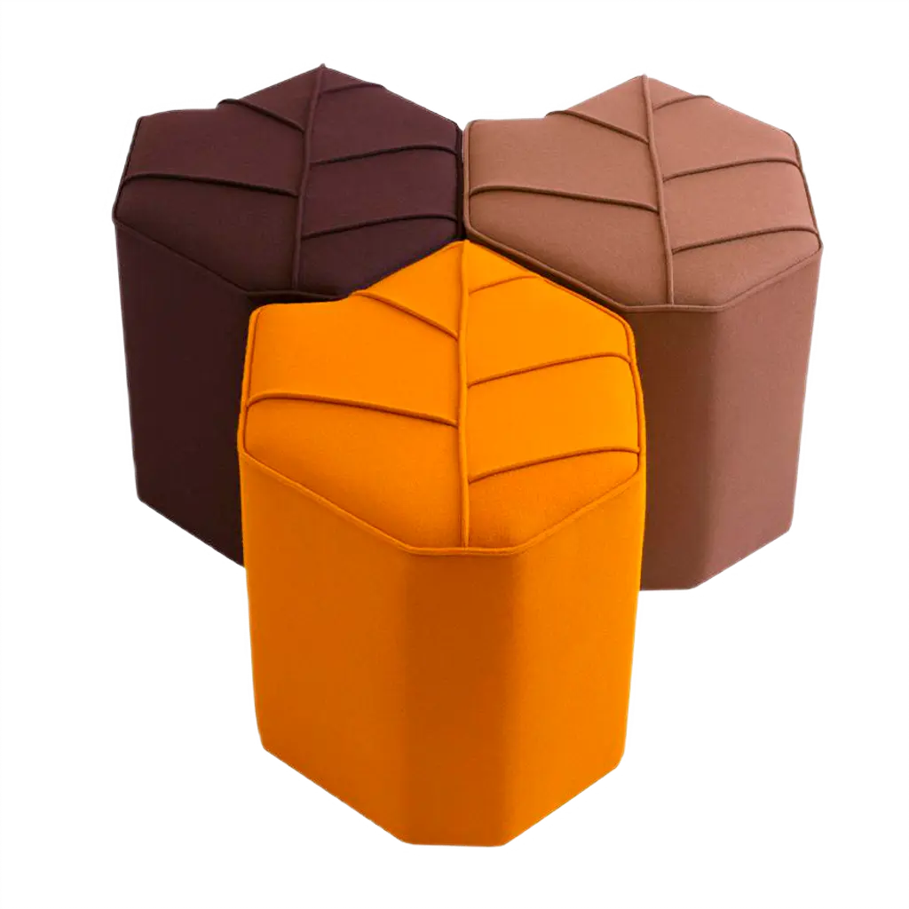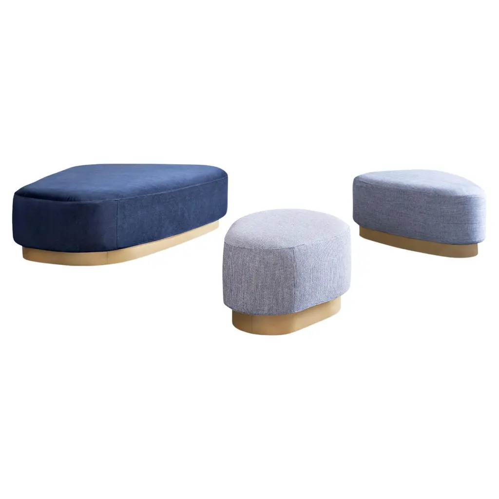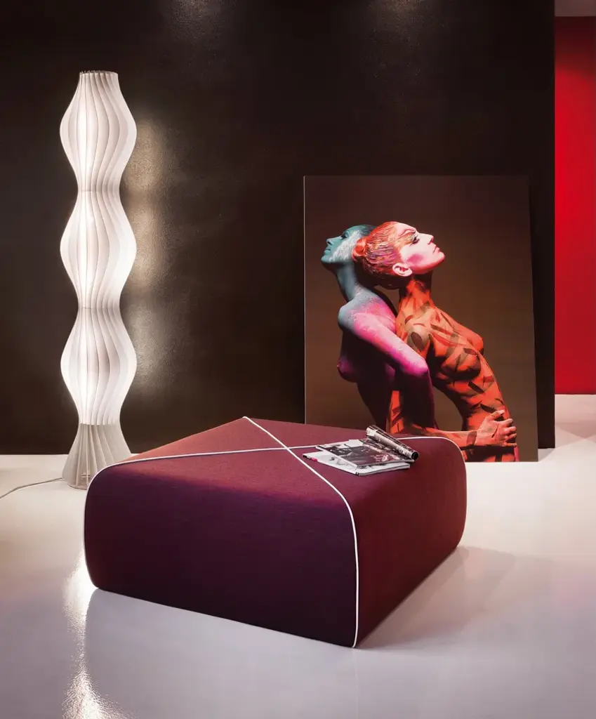 Crossed - Soft padded pouf with contrasting cross stitching available in two versions with square and rectangular bases that can be mixed and matched to create various shape and colour arrangements. Made of polyurethane foam upholstered in fabric or leather.