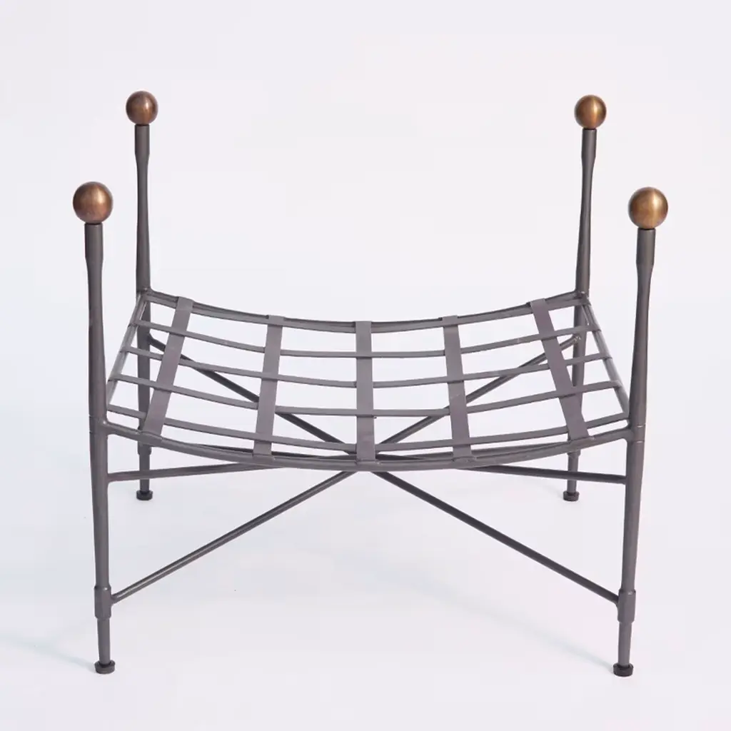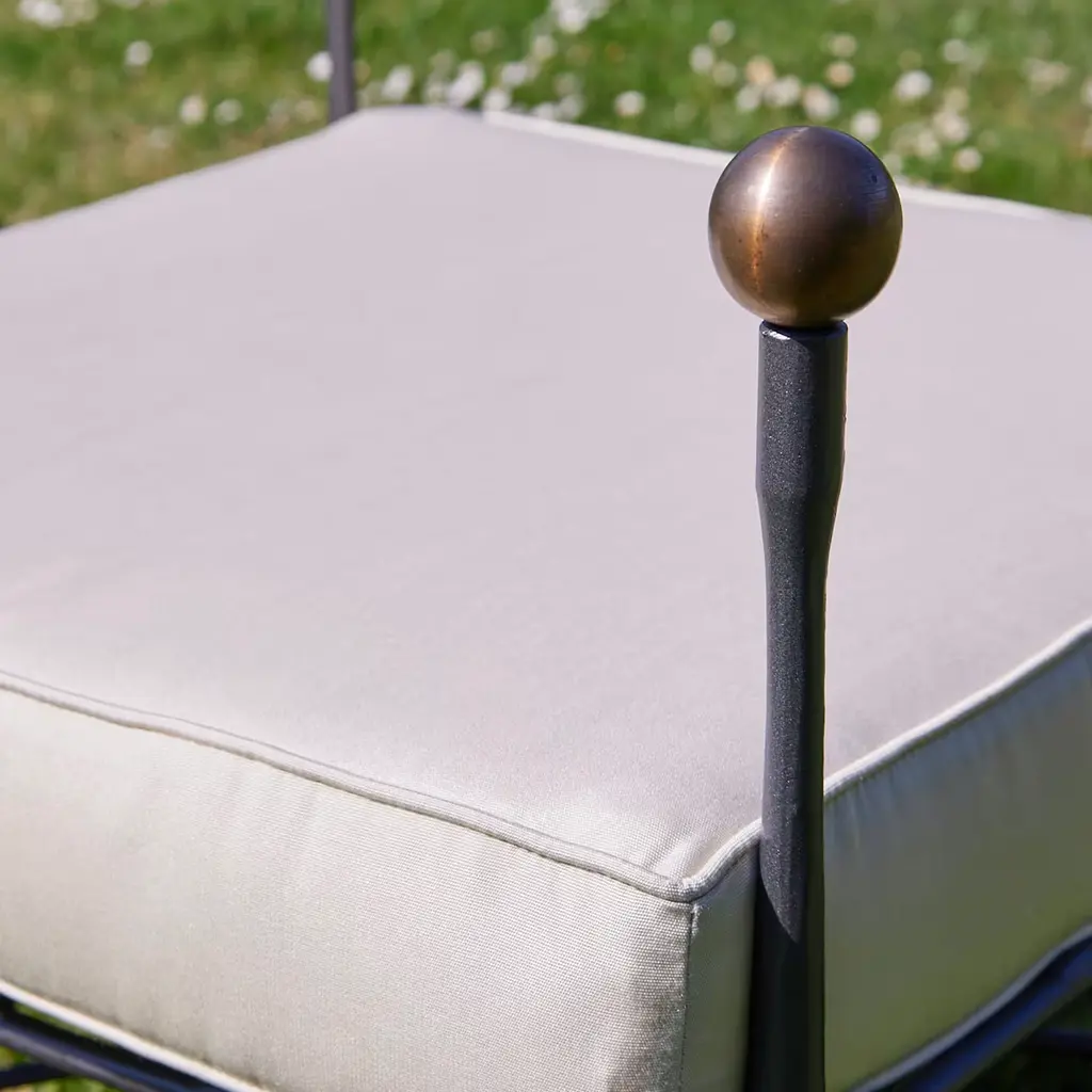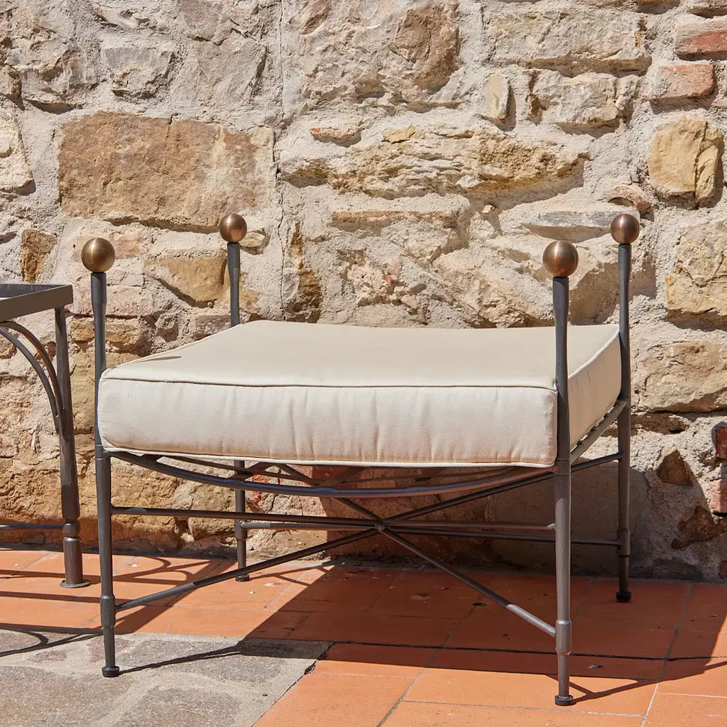 Refinement and durability define this exclusive artisan pouf designed for safe outdoor use. Enriched with burnished brass knobs, the cross weave iron structure - hot-dip galvanized and fire-varnished in graphite gray - welcomes a plush and removable beige cushioning named Sunbrella "Canvas" that ensures resistance to both water and stains. A similar, lower version is also available.