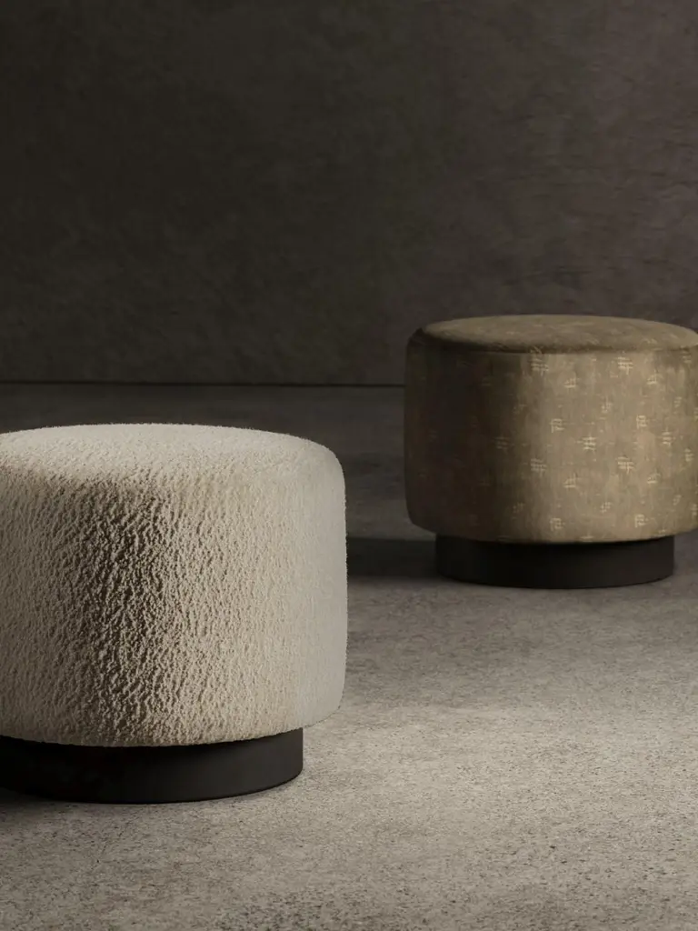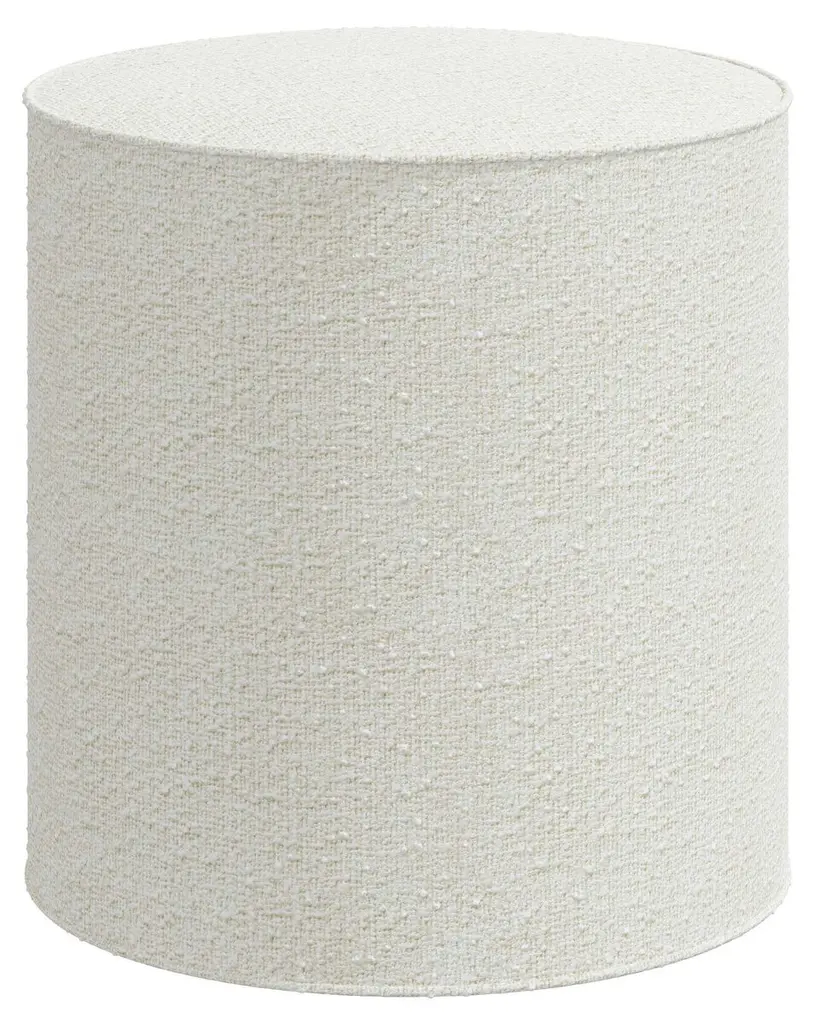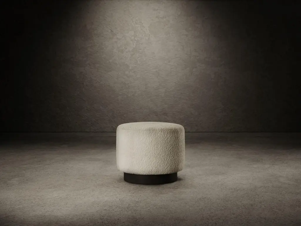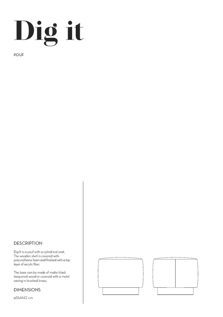 Dig It is a pouf with a cylindrical seat. The wooden shell is covered with polyurethane foam and finished with a top layer of acrylic fiber. The base can be made of matte black lacquered wood or covered with a metal casing in brushed brass.This version of DIG IT pouf with matt black wood base is upholstered with White Nimbus fabric By Dedar, a soft and contrasting tones Bouclè Wool .DIMENSIONS: ø51xH42 cm