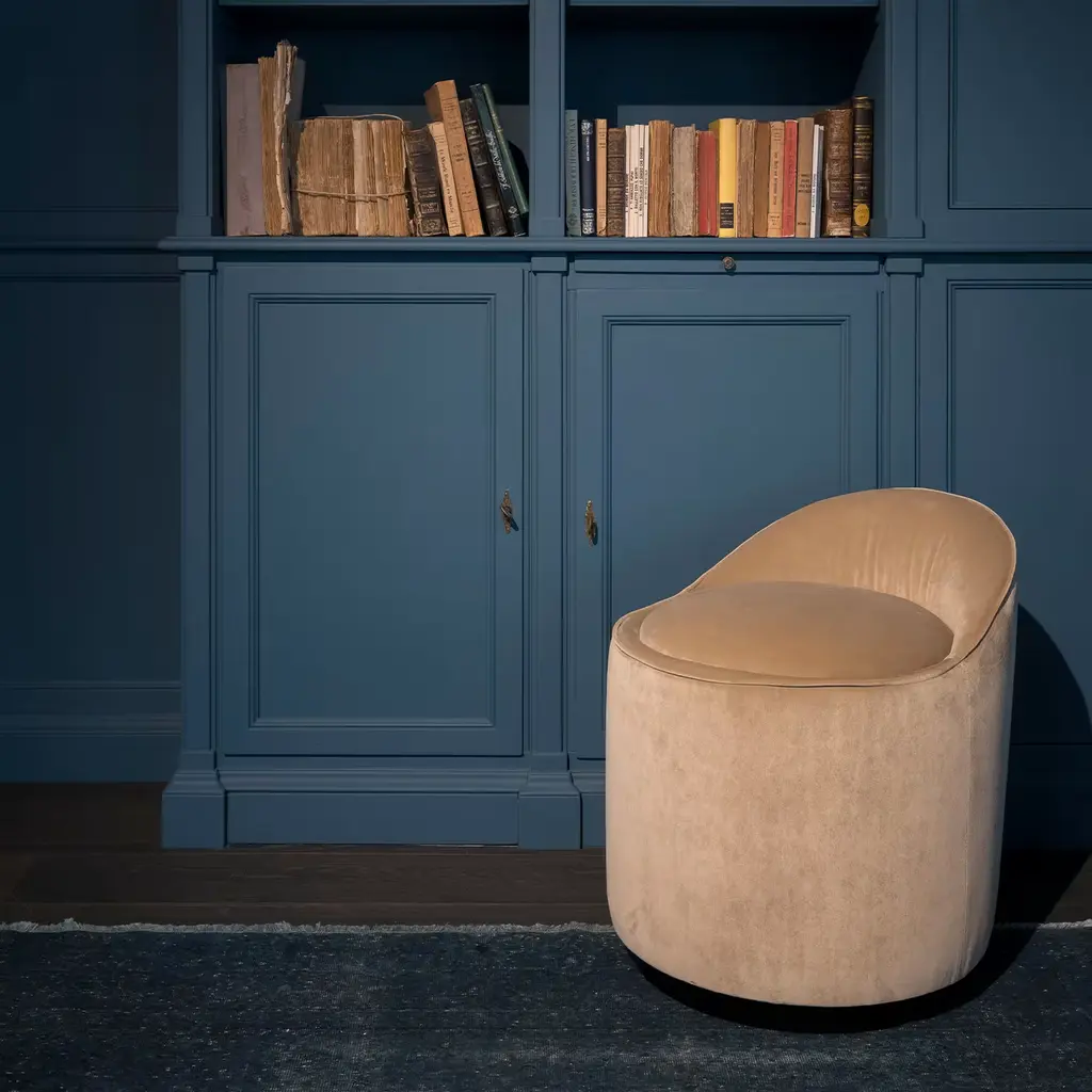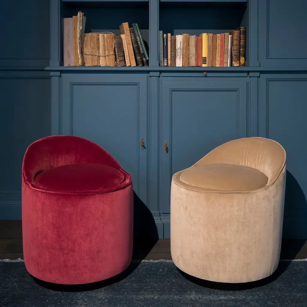 Brimming with classical elegance, this exquisite pouf will effortlessly blend in a wide variety of indoor contexts. The cylindrical silhouette in solid wood upholstered in beige-hued velvet (non-removable) is generously stuffed with polyurethane and lined with a protective fabric for impeccable comfort. The black-varnished wooden base and the demi-lune lower back support integrated into the seat seals the design. Contact the Concierge for customizations available.