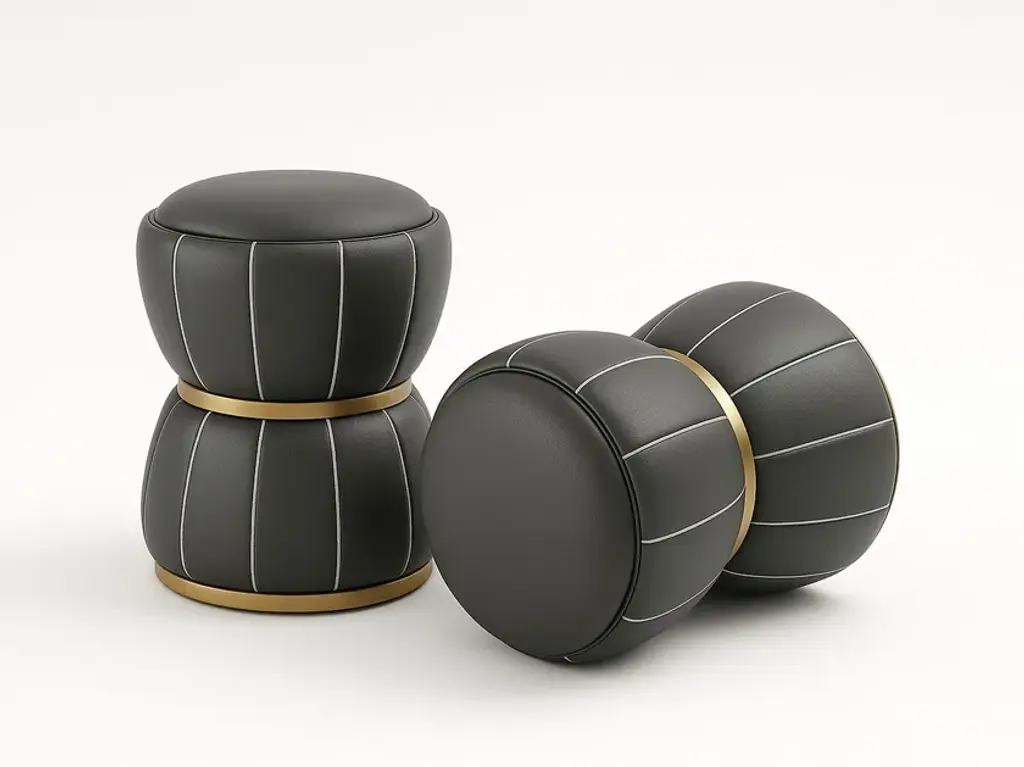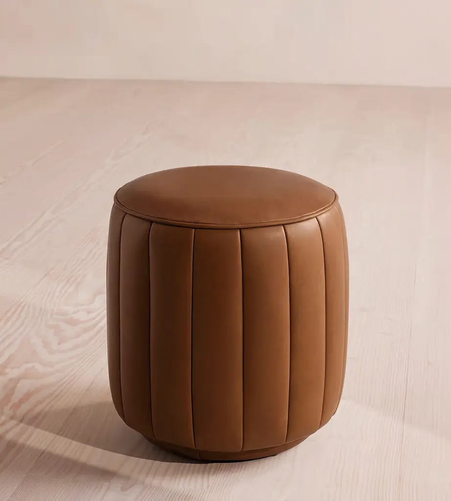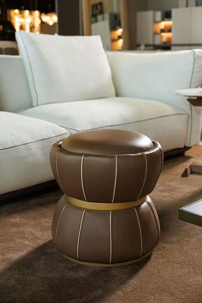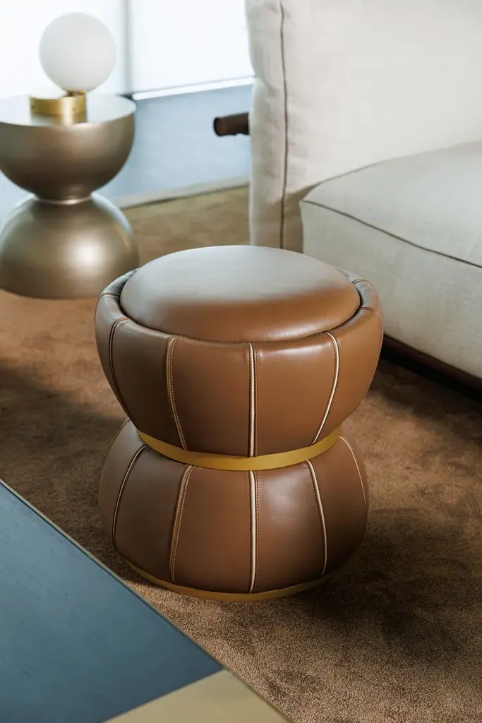 ELIZABETH can be used as a pouf or as a bag stool, providing a worthy podium for showcasing noteworthy bags in restaurants or other high-end establishments.The hourglass feminine figure of ELIZABETH is accentuated by a contrasting MDF line that runs through the middle of the pouf, creating a visually captivating design. The symmetrical linear leather patterns that adorn its body can be customized to come in a mono color or contrasting combination, allowing for a personalized touch.ELIZABETH features a sturdy wood structure and can be upholstered in fabric, providing a wide range of options to suit individual preferences.Structure: WoodUpholstery: Fabric